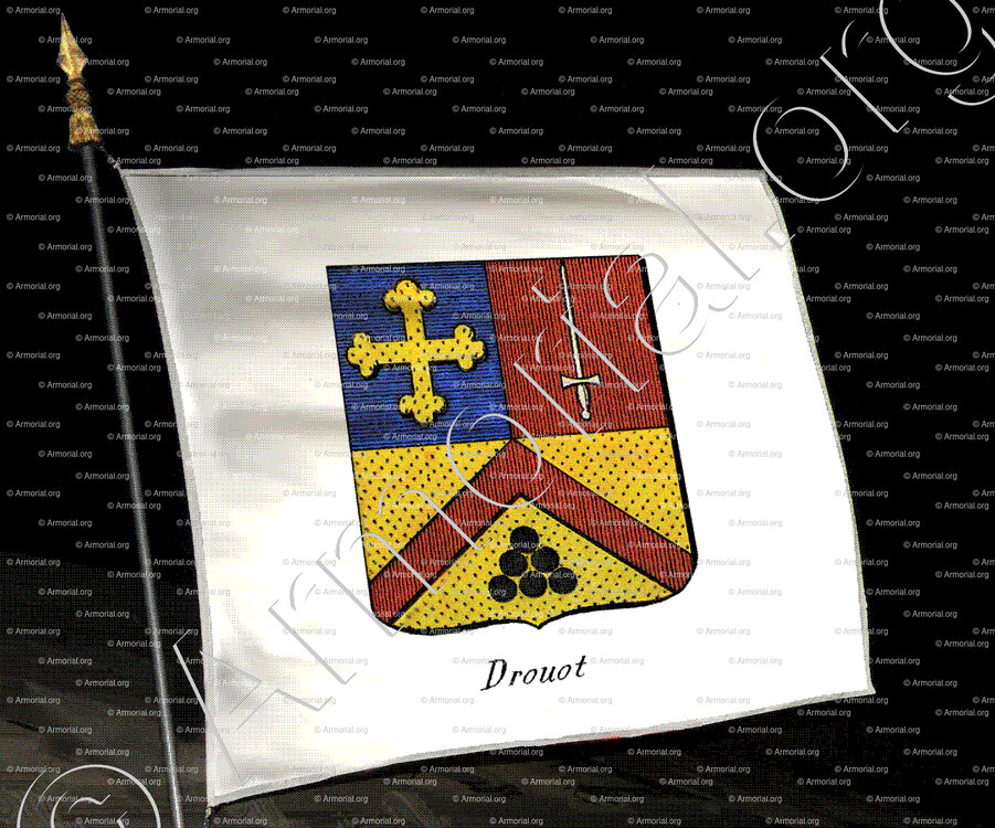 - C'est par suite d'une erreur du dessinateur du Conseil du Sceau des titres qu'il y a une croix tréflée dans les armes du général DROUOT, au lieu d'une croix de Lorraine, ainsi qu'il l'avait demandé en 1810, quand il reçut le titre de baron. La même erreur se reproduisit dans les armoiries du comte, conférées en 1814.