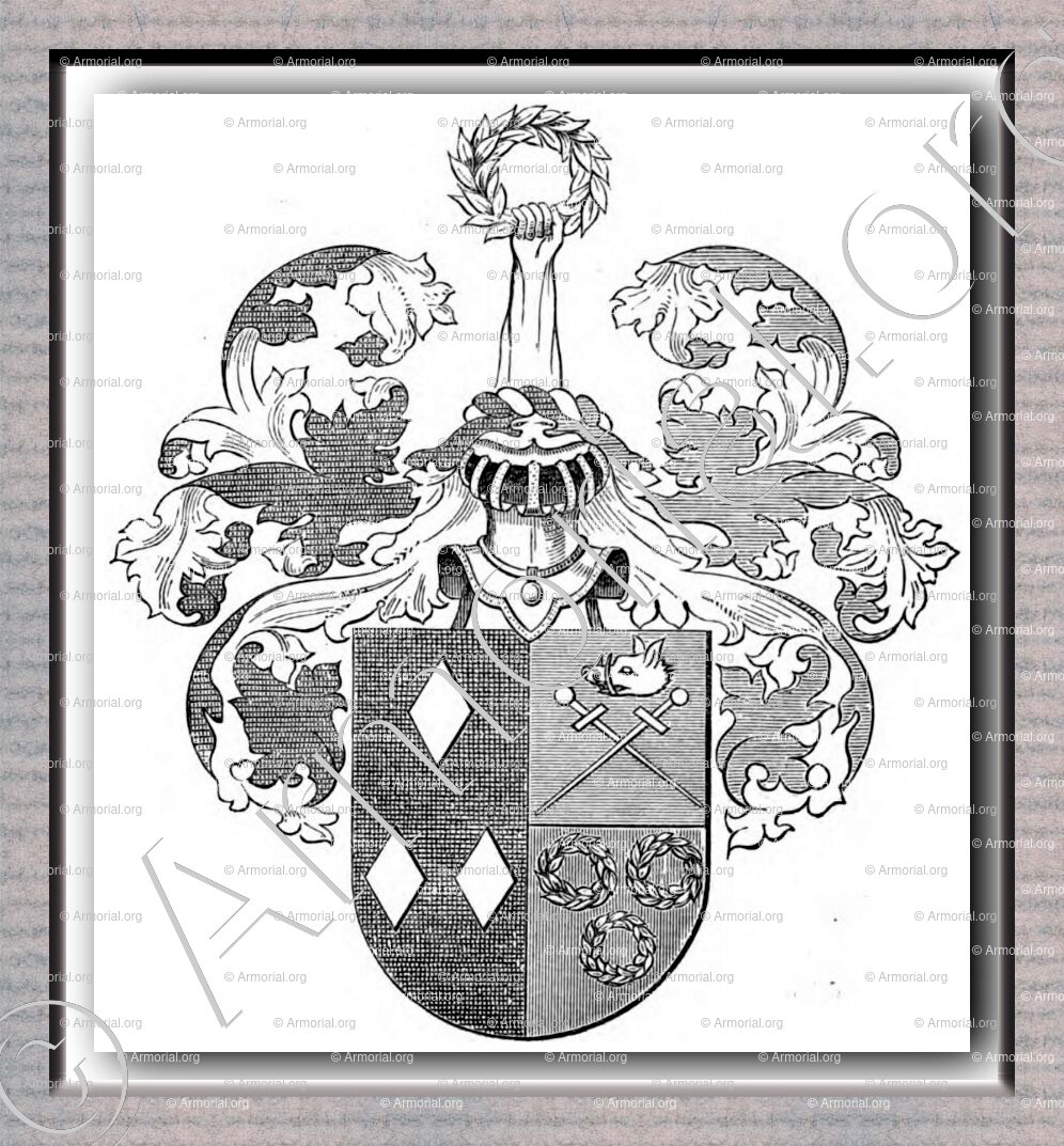 - Cimier: un bras de carnation, en pal, tenant une couronne de feuillage au naturel. (Armes de Nicolas B., célèbre auteur hollandais, né le 13 sept. 1814.).