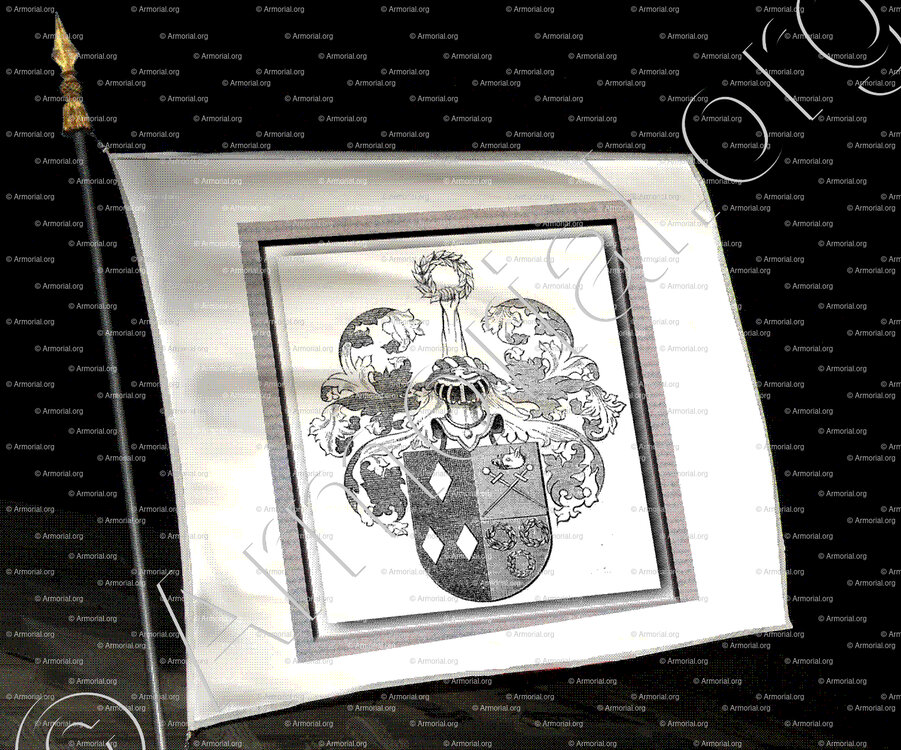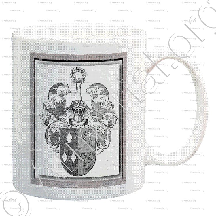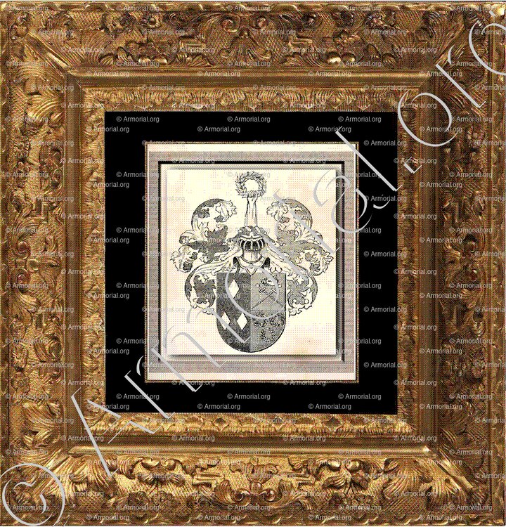 Parti: au 1, de sable, à trois losanges mal-ordonnée d'argent; au 2, coupé: a. d'azur à deux bourdons de pèlerin d'or, passés en sautoir, surmontés d'une hure de sanglier d'argent; b. de gueules à trois couronnes de feuillage d'argent. "