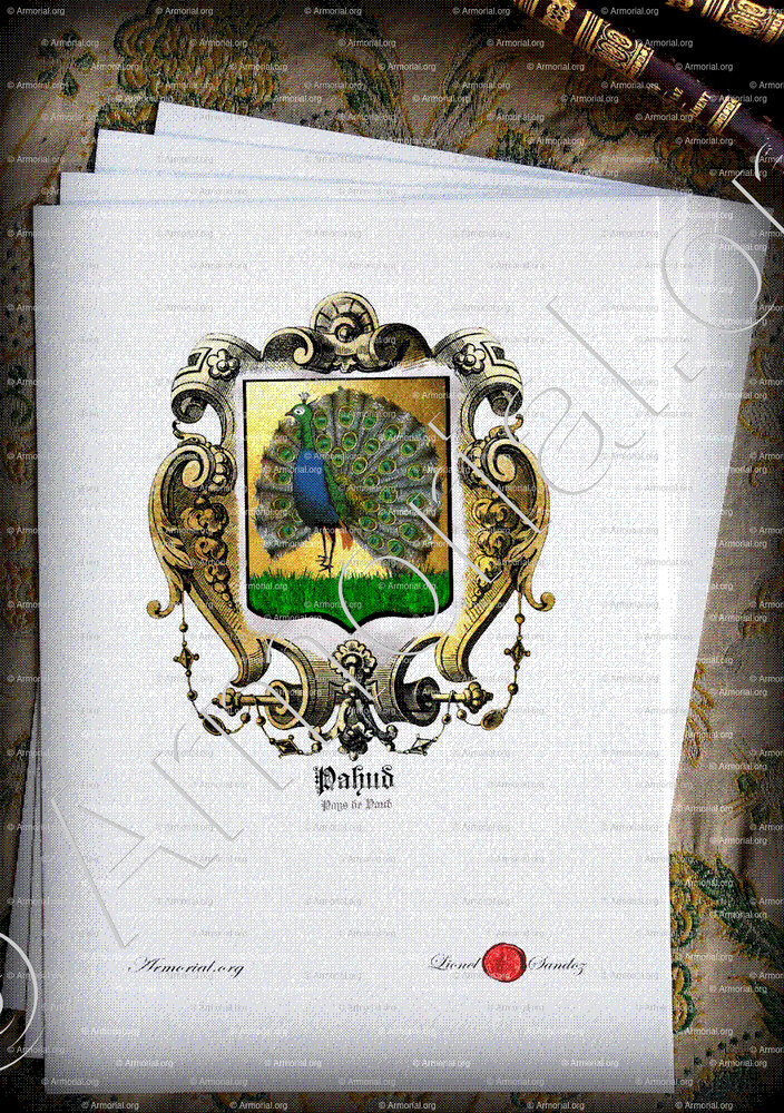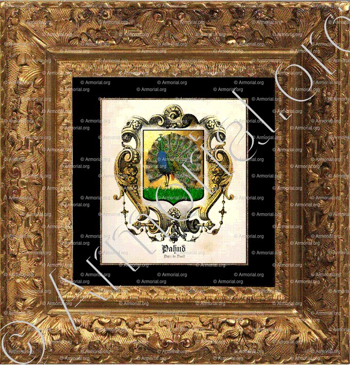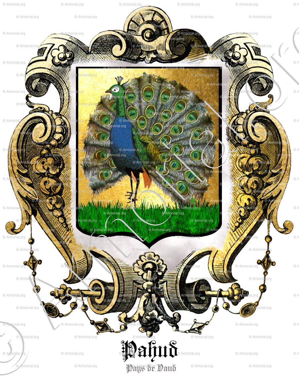 Dans son MS 1720, Olivier donne l’écu de D. Pahud 1719 avec " le paon de profil sur trois monts ".