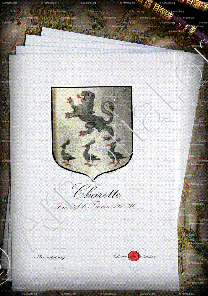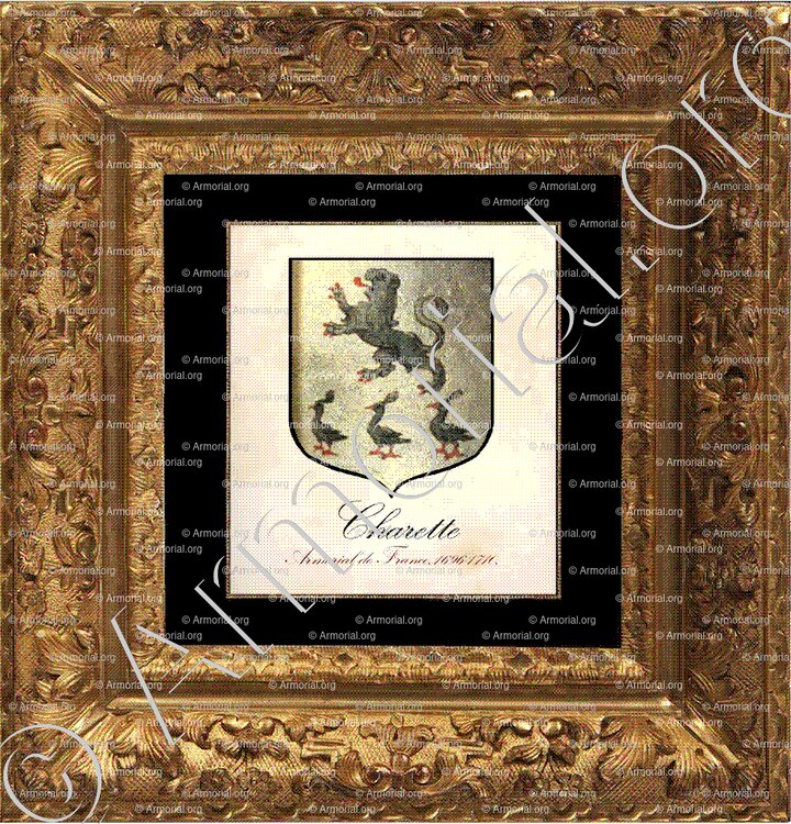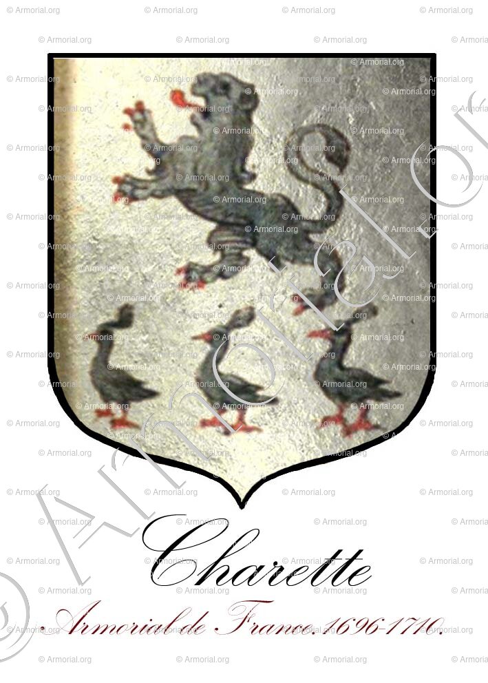 Guillaume CHARETTE, s' de Trévignes, in the Chapel near Ploërmel, lived in 1334, appeared on the watch of the nobles of the bishopric of Saint-Malo, and had two sons Guillaume II who follows, and Perrot, s' de Trevignez, mentioned in ref. of 1426, father of Guyon who was part of the watch of 1467 and was himself father of other Guyon, of the Reformation of the nobility of Brittany of 1513, and of Pierre, rector of Saint-Abraham (Des Salles, Anc . reference of the bishopric of Saint-Malo, p. 57, 216).
