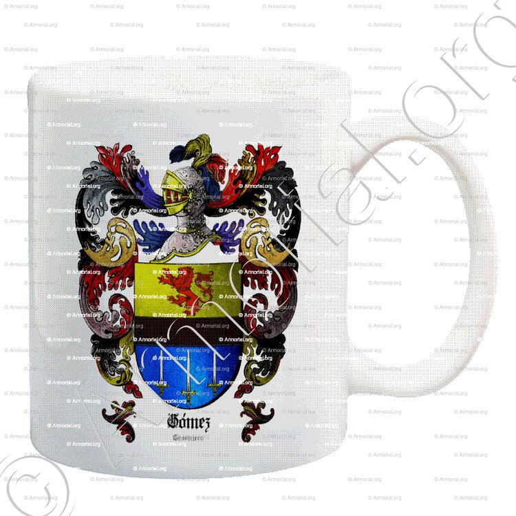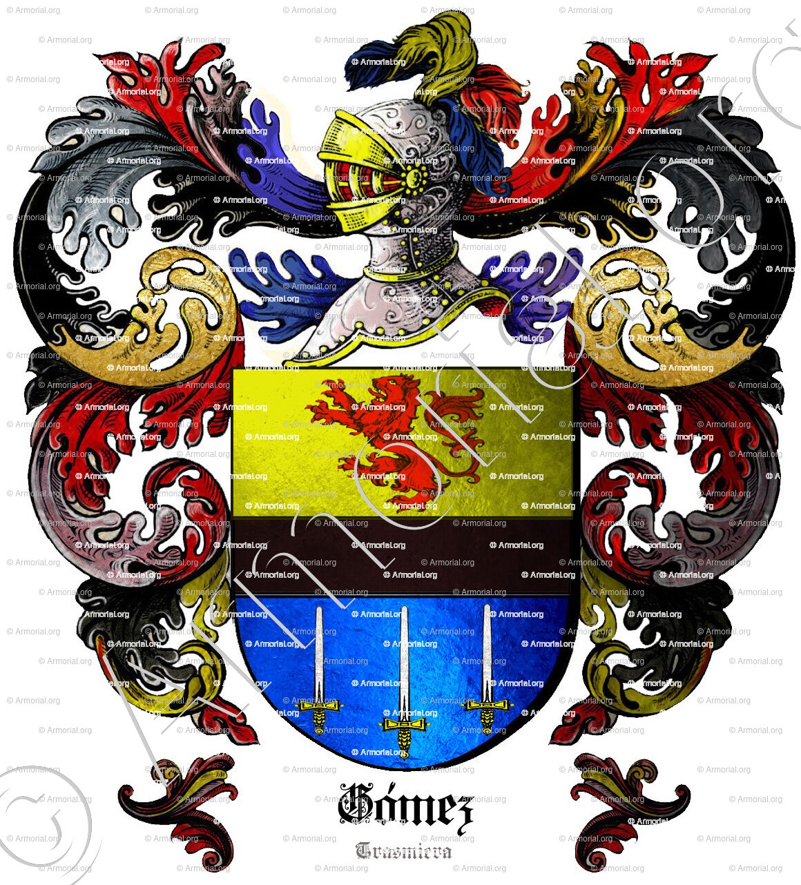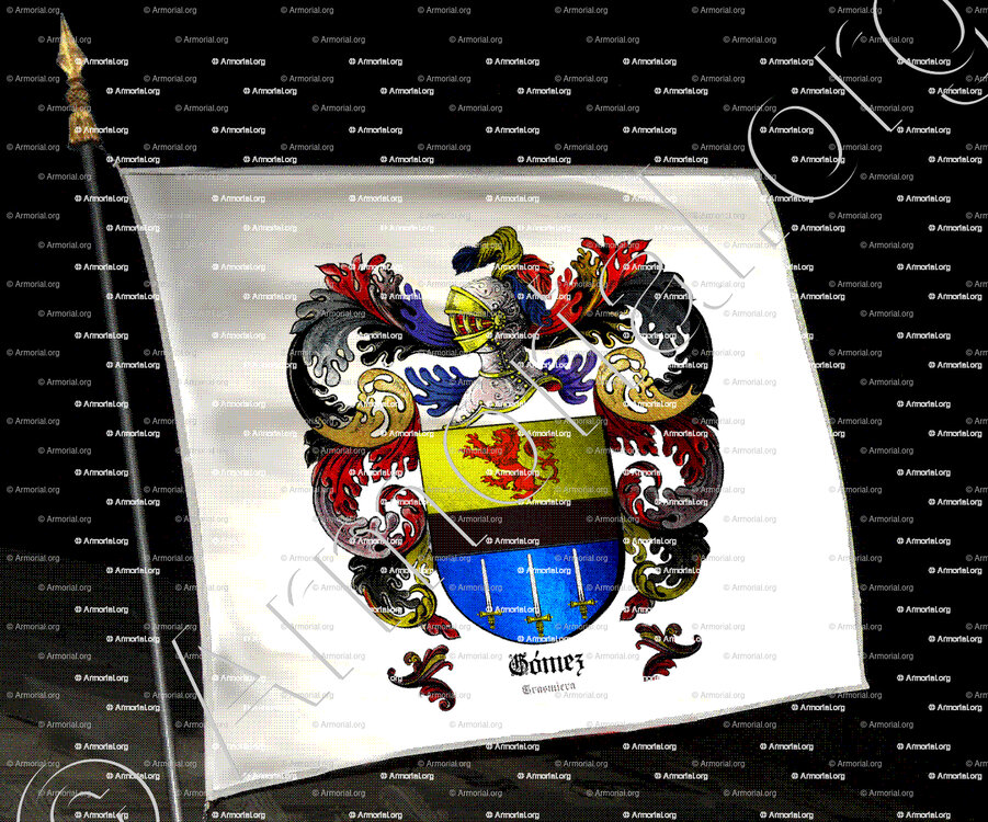 "Cortado : al 1° de oro con un león rampante, de gules; al 2°, de azur, con tres espadas de plata, adornada de oro, en amigos, las puntas en lo alto. A la faja de sable, brochando en la cortado. ”
