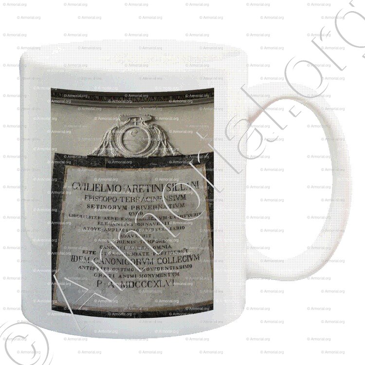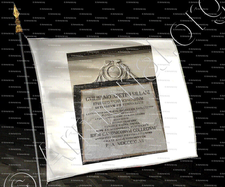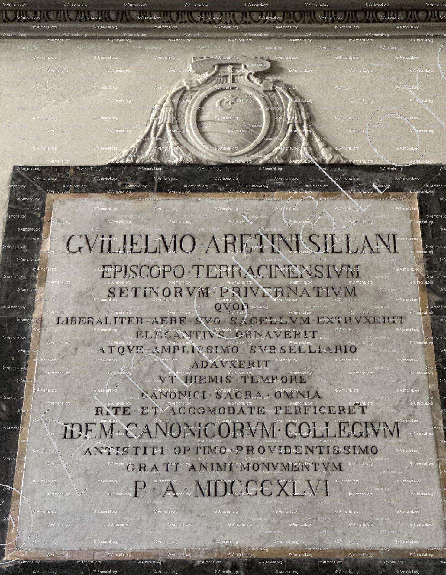 Iscrizione in latino dedicata a Guglielmo Aretini-Sillani, vescovo delle diocesi di Terracina, Sezze e Priverno, datata 1846.
