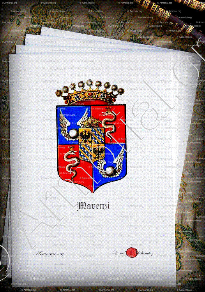 " Écartelé: aux 1 et 4, d'azur, à une boule ailée d'argent; aux 2 et 3, de gueules, à une couleuvre ondoyante en pal d'argent, couronnée d'or. Sur le tout un écusson écartelé, timbré d'une couronne; aux 1 et 4, de MARENZI qui est d'or à l'aigle de sable, couronnée d'or; aux 2 et 3, d'or, à trois bandes échiquetées d'azur et d'argent. "