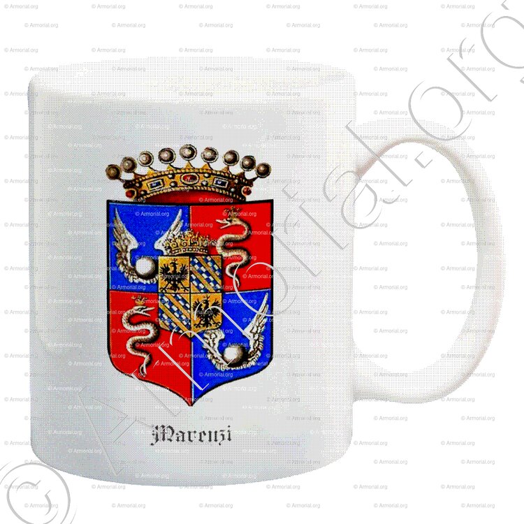 "Gevierendeeld: in 1 en 4, van azuur, met een gevleugelde zilveren bol; in 2 en 3, van keel, met een slang golvend in paal van zilver, gekroond van goud. Over alles een hartschild, gevierendeeld, getopt met een kroon; in 1 en 4, van MARENZI, dat is van goud met een adelaar van sabel, gekroond van goud; in 2 en 3, van goud met drie schuinbalken geruit van azuur en zilver."