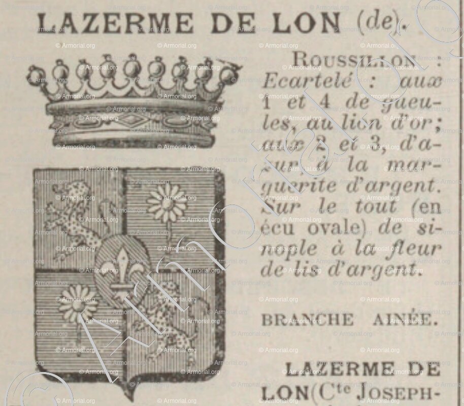 Famille LAZERME DE LON - Blason LAZERME DE LON - Blasonnement LAZERME DE LON - Armoiries LAZERME DE LON - Armoiries de famille LAZERME DE LON - Armorial LAZERME DE LON - Armes LAZERME DE LON - Armes sur un écu LAZERME DE LON - Ecu LAZERME DE LON - Ecus armoriés LAZERME DE LON - Bannière, flanchières, caparaçon armoriés LAZERME DE LON - Bouclier armorié LAZERME DE LON - Sceau LAZERME DE LON - Sceau armorié LAZERME DE LON - Archives LAZERME DE LON - Généalogie LAZERME DE LON - Arbre généalogique LAZERME DE LON - Ascendance LAZERME DE LON - Descendance LAZERME DE LON - Héraldique LAZERME DE LON - Origine LAZERME DE LON - Les LAZERME DE LON dans l'Histoire - Les LAZERME DE LON dans la noblesse - Devise LAZERME DE LON - Armoiries de bourgeoisie LAZERME DE LON - Armoiries de noblesse LAZERME DE LON.