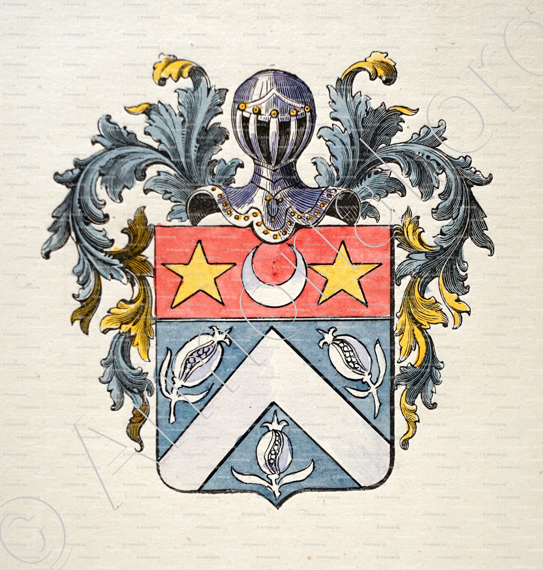 " D'azur, au chevron d'argent, accompagné de trois grenades d'argent, tigées et feuillée, au chef cousu de gueules chargé d'un croissant d'argent, accosté de deux étoiles d'or. "