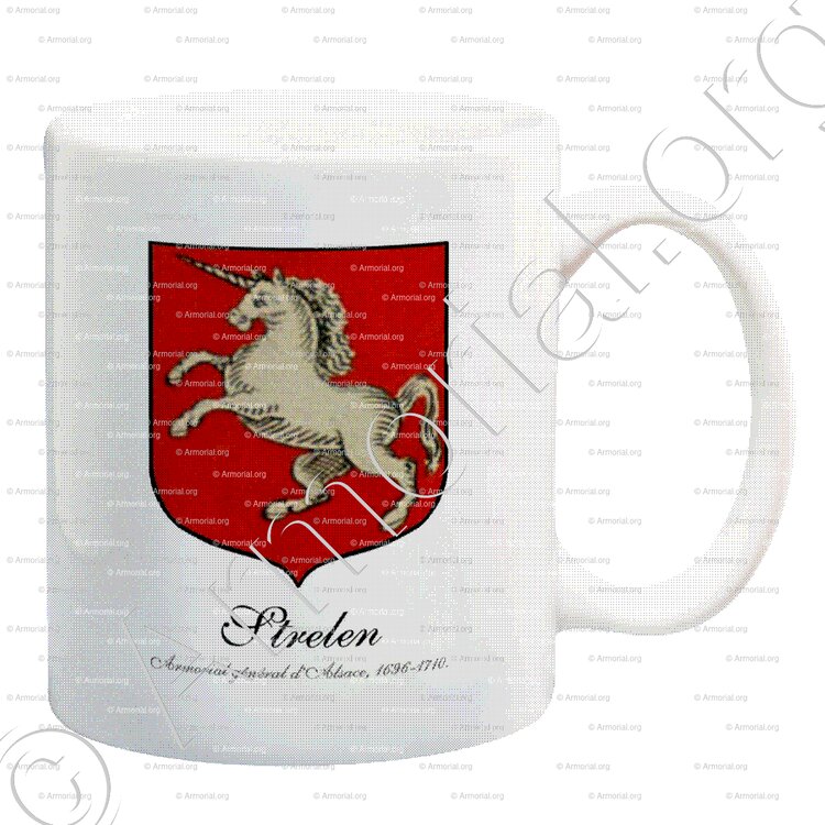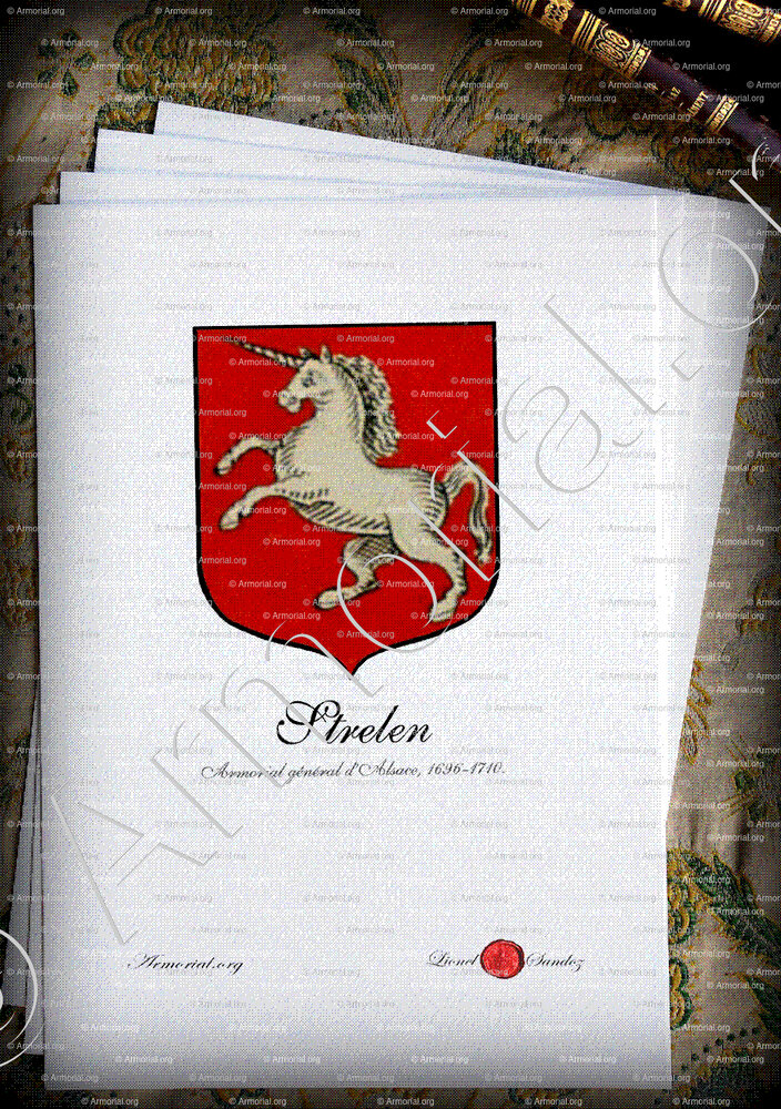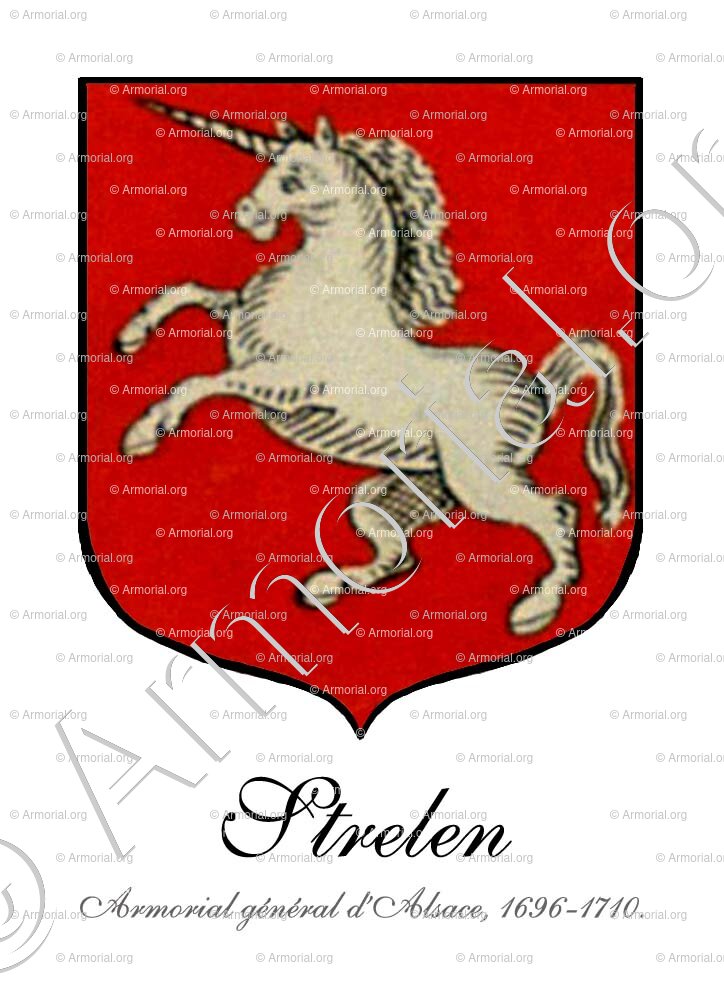 Les armoiries des STRELEN d’Alsace, telles que décrites dans les documents, sont " De gueules à une licorne saillante d’argent ".