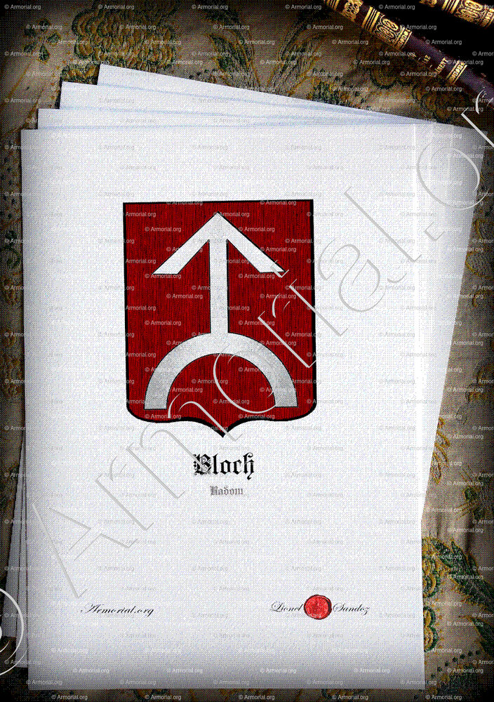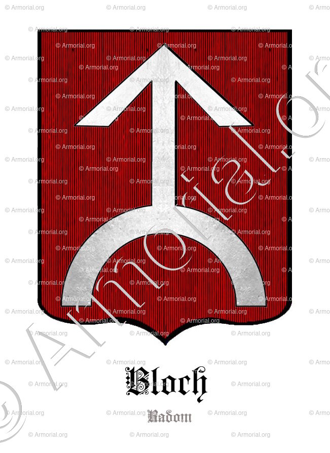 ✶ Le blason des BLOCH se décrit ainsi : De gueules, une demi-flèche d’argent pointant vers le haut, soutenue par un demi-anneau.