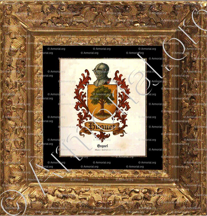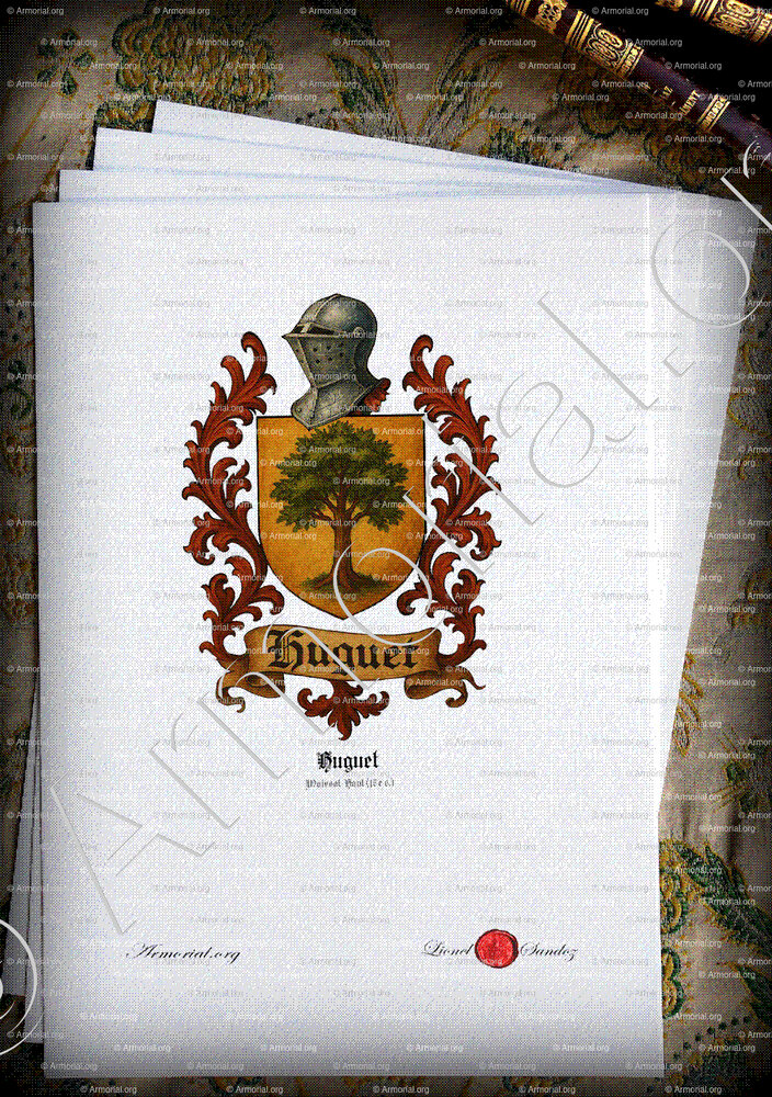 HUGUET de Cisterolx, non localisé, XVe s.? : " D'argent, chevron de gueules, trois tourteaux. " Cimier : Tête et col de cerf