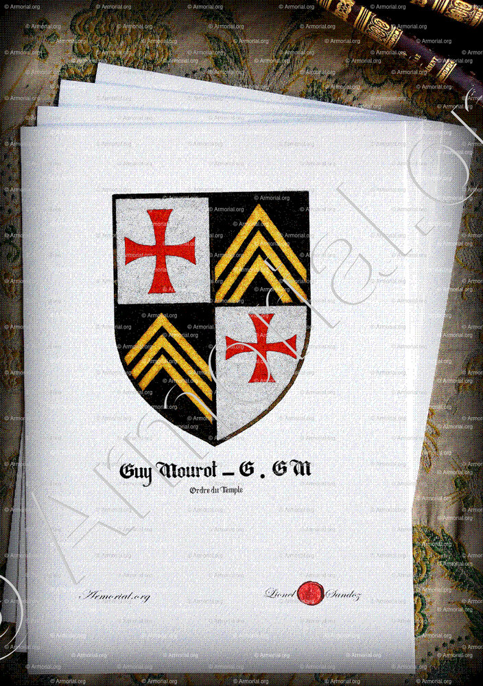 - En tant qu’héritier désigné par une providence sacrée de Jacques de MOLAY, dernier Grand Maître des Templiers, GUY MOUROT pourrait percevoir dans ses armoiries une continuité symbolique empreinte de destin.