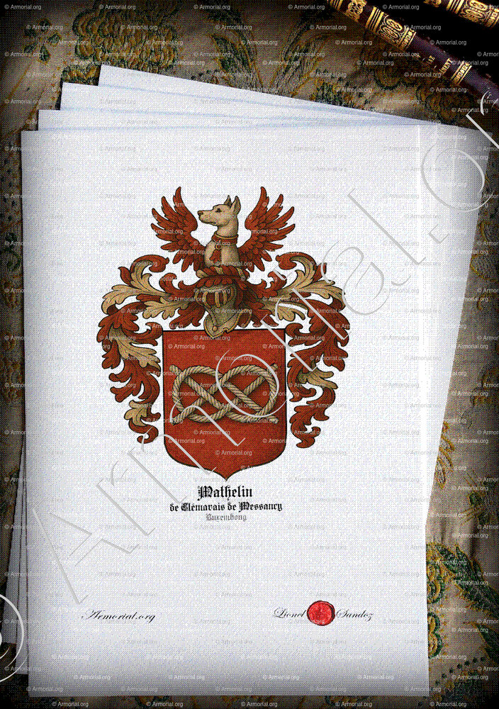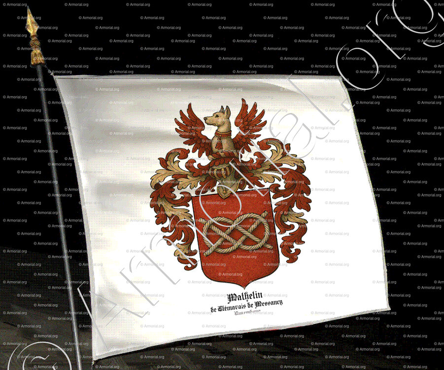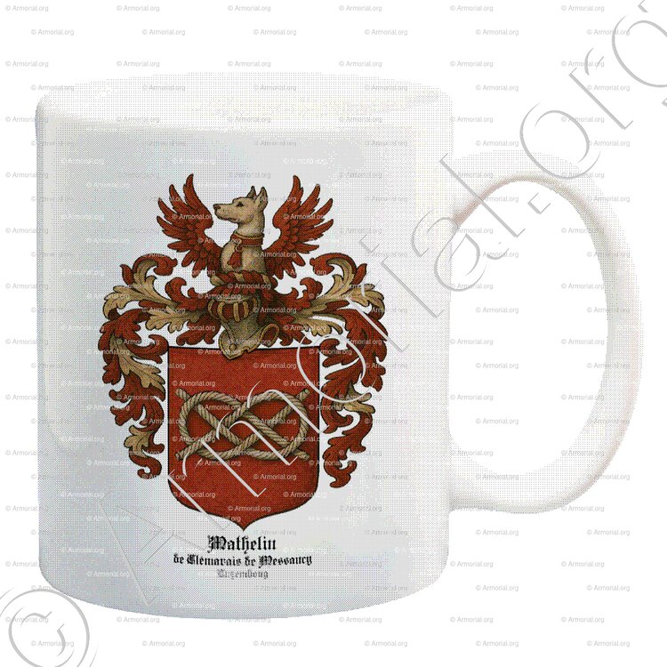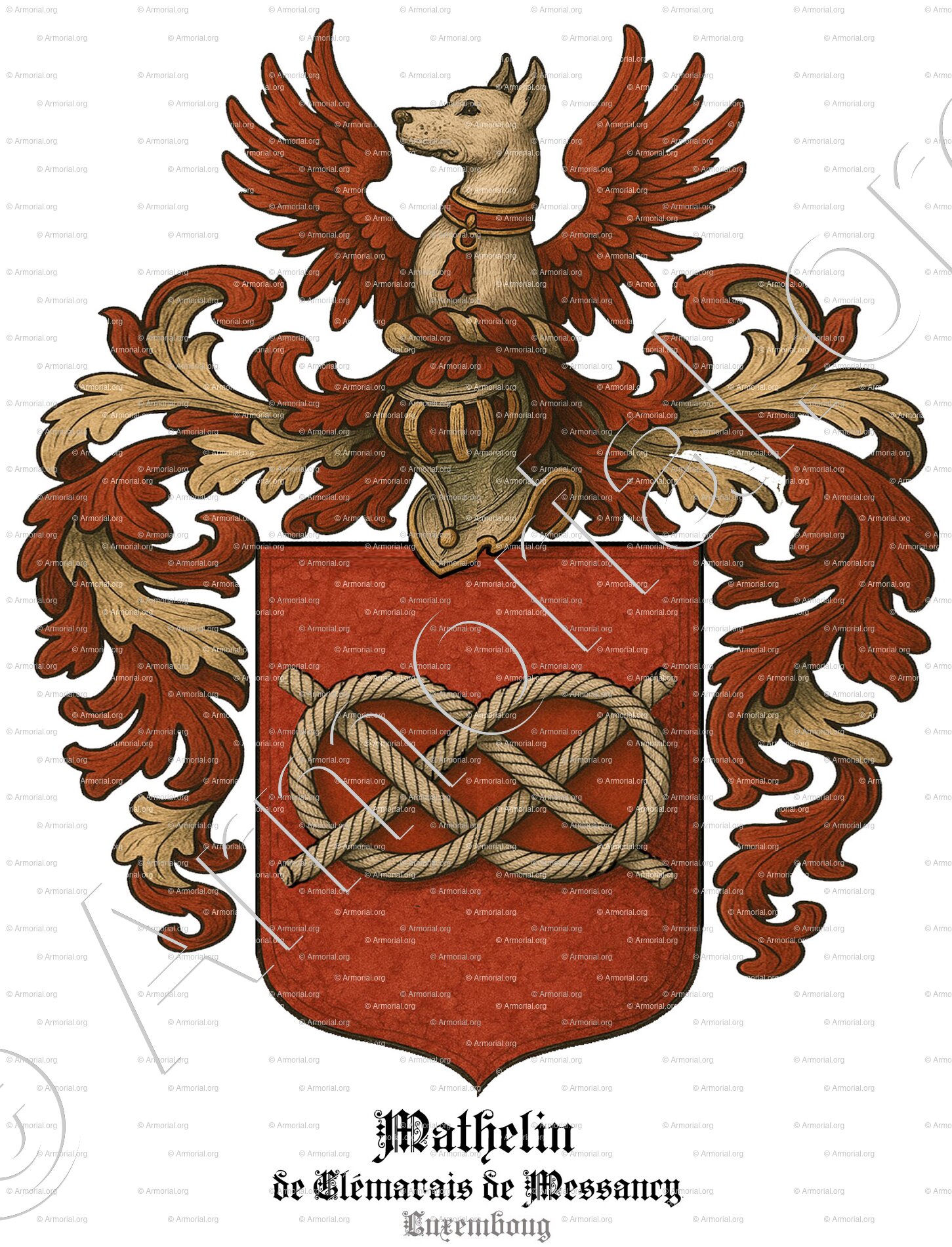 La famille Mathelin, parfois orthographiée Demathelin sous le régime français, est issue de la noblesse régionale. Son nom est lié aux seigneuries de Clémarais (Aubange) et de Messancy, où elle possédait des propriétés, notamment le château de Messancy. Les armoiries familiales, décrites comme « de gueules à deux lacs d’amour entrelacés d’argent, posés de fasce, sommé d’un haume d’argent grillé et liseré d’or, avec un chien bracque naissant au naturel », témoignent de son statut noble et sont visibles sur le monument funéraire du cimetière de Messancy ainsi que sur la tour nord du château avant sa destruction.