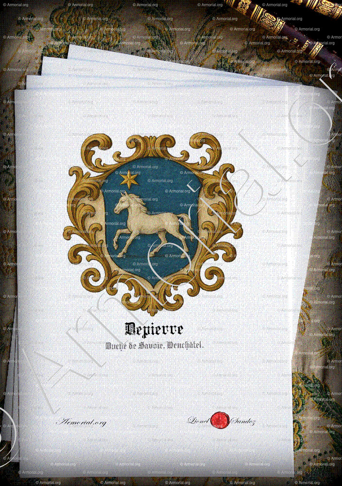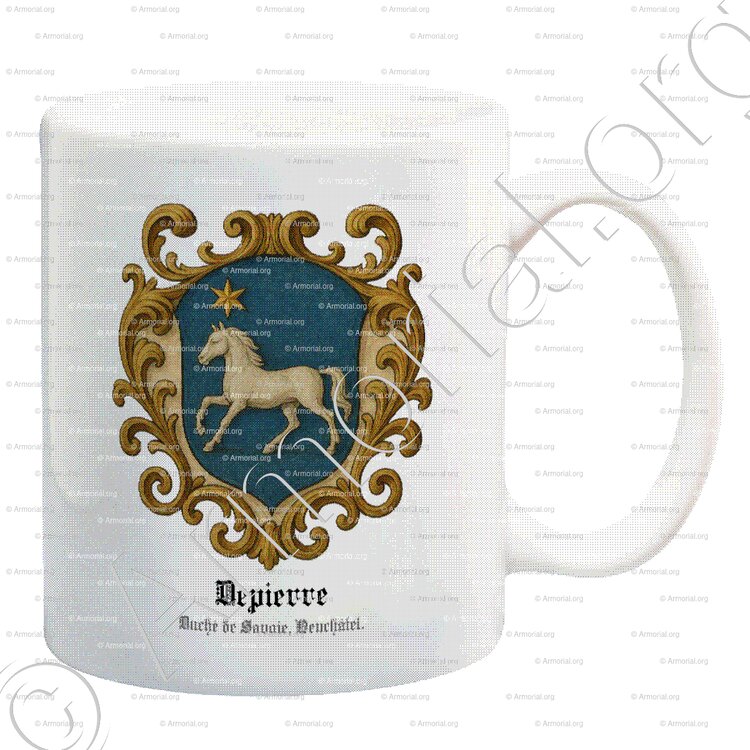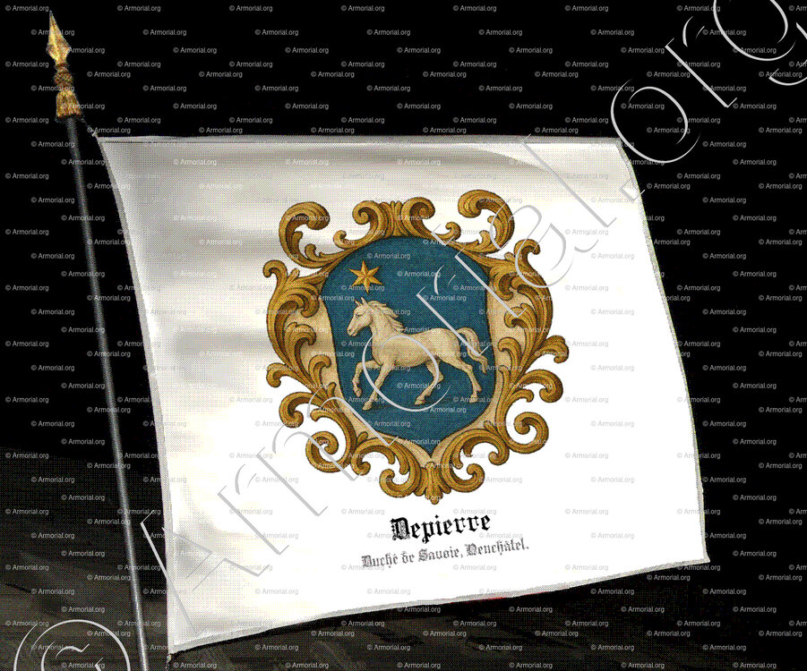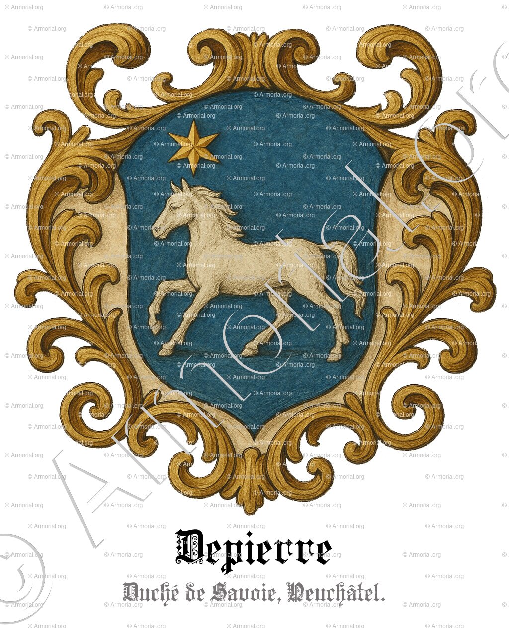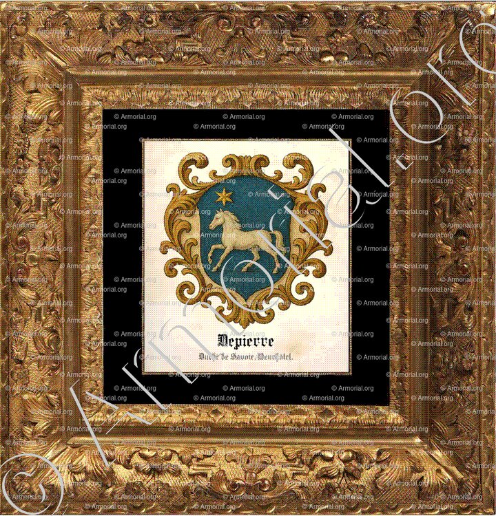 Selon l’Armorial d’Europe de J.B. Rietstap (1884, 1934), les armoiries de la famille DEPIERRE de Neufchâtel (Suisse) se décrivent comme : D’azur, à un cheval passant d’argent, accompagné au canton senestre du chef d’une étoile (6) d’or. La composition est similaire à celle de France, avec une différence dans la position de l’étoile (à senestre, soit à gauche). Cette variation pourrait indiquer une branche distincte ou une adaptation régionale, tout en conservant les mêmes symboles fondamentaux : l’azur pour la loyauté, le cheval pour la noblesse et