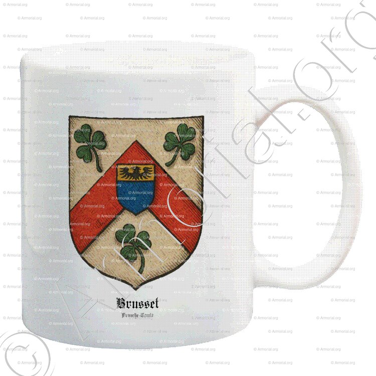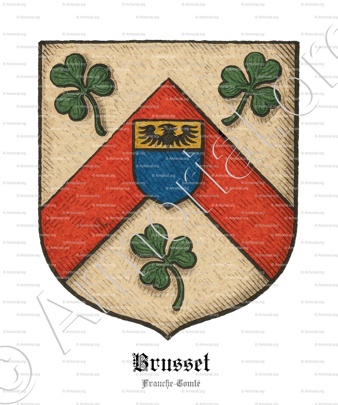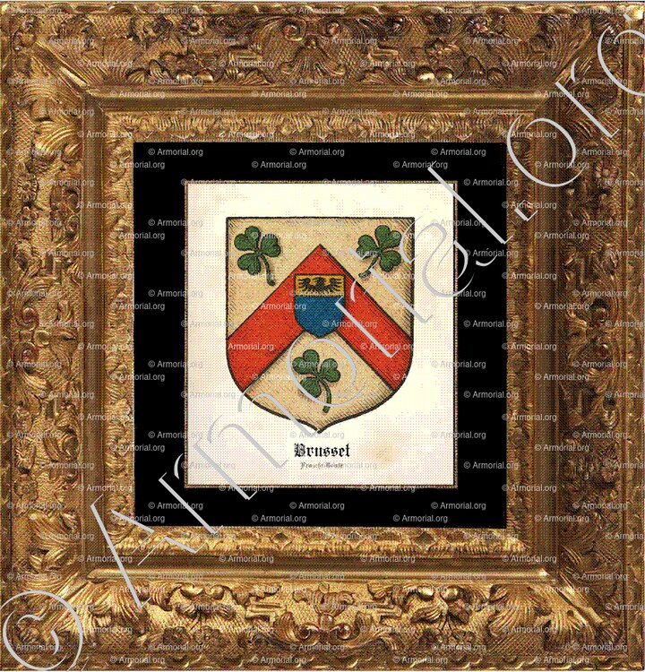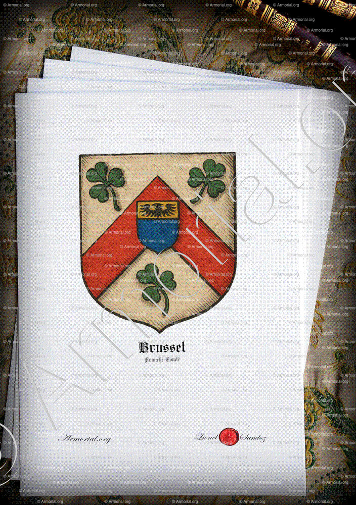 - BRUSSET de Franche-Comté : D'argent, au chevron de gueules accompagné de trois trèfles de sinople (deux penchés vers le chevron, un en bande), le chevron chargé d’un écusson d’azur au chef d’or avec une aigle de sable. Bourlet et lambrequin d’argent et de sinople, cimier un dragon d’or.