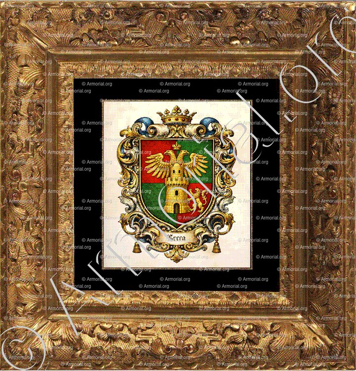 " Écartelé de gueules et de sinople (1 et 4 de gueules, 2 et 3 de sinople), souvent brochant sur le tout un château (ou tour donjonnée) d'argent (ou d'or) surmonté d'une aigle éployée (parfois impériale bicéphale et couronnée d'or), et parfois accompagné en pointe d'un lion passant ou rampant d'or. "