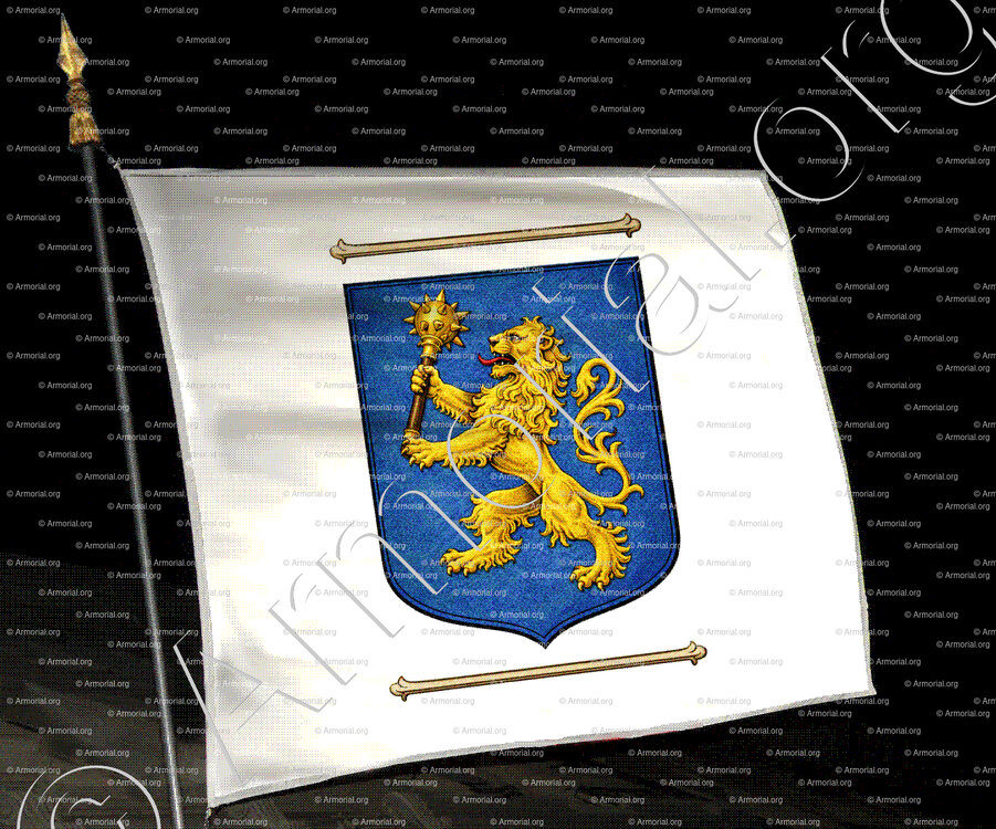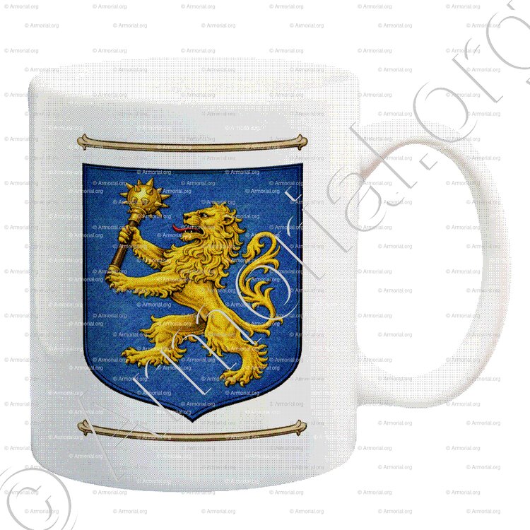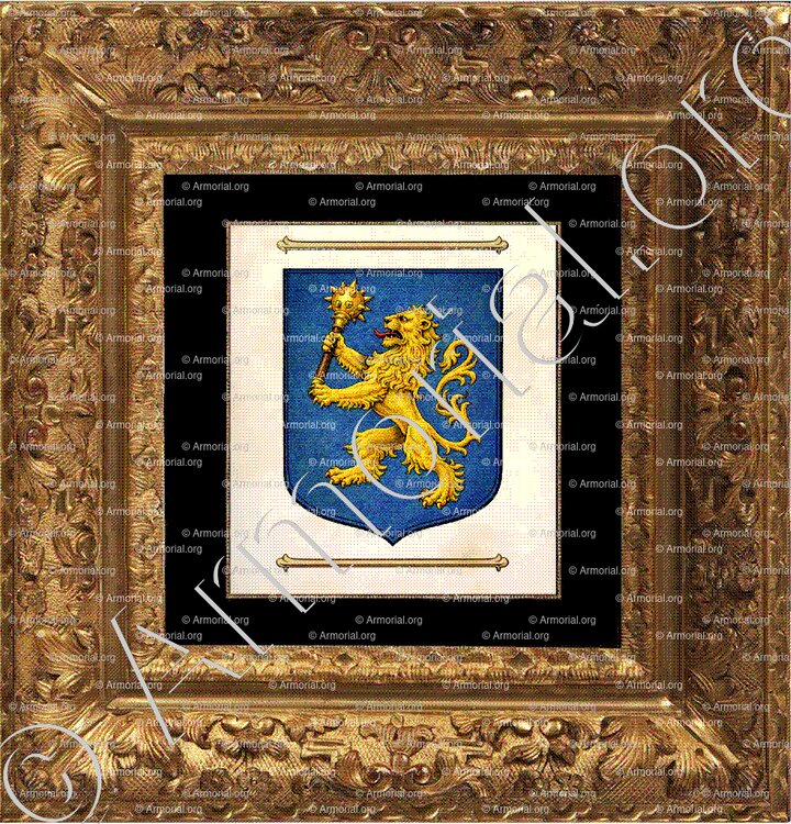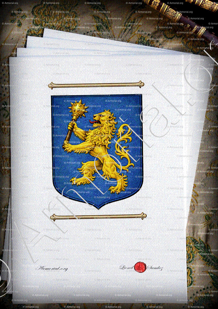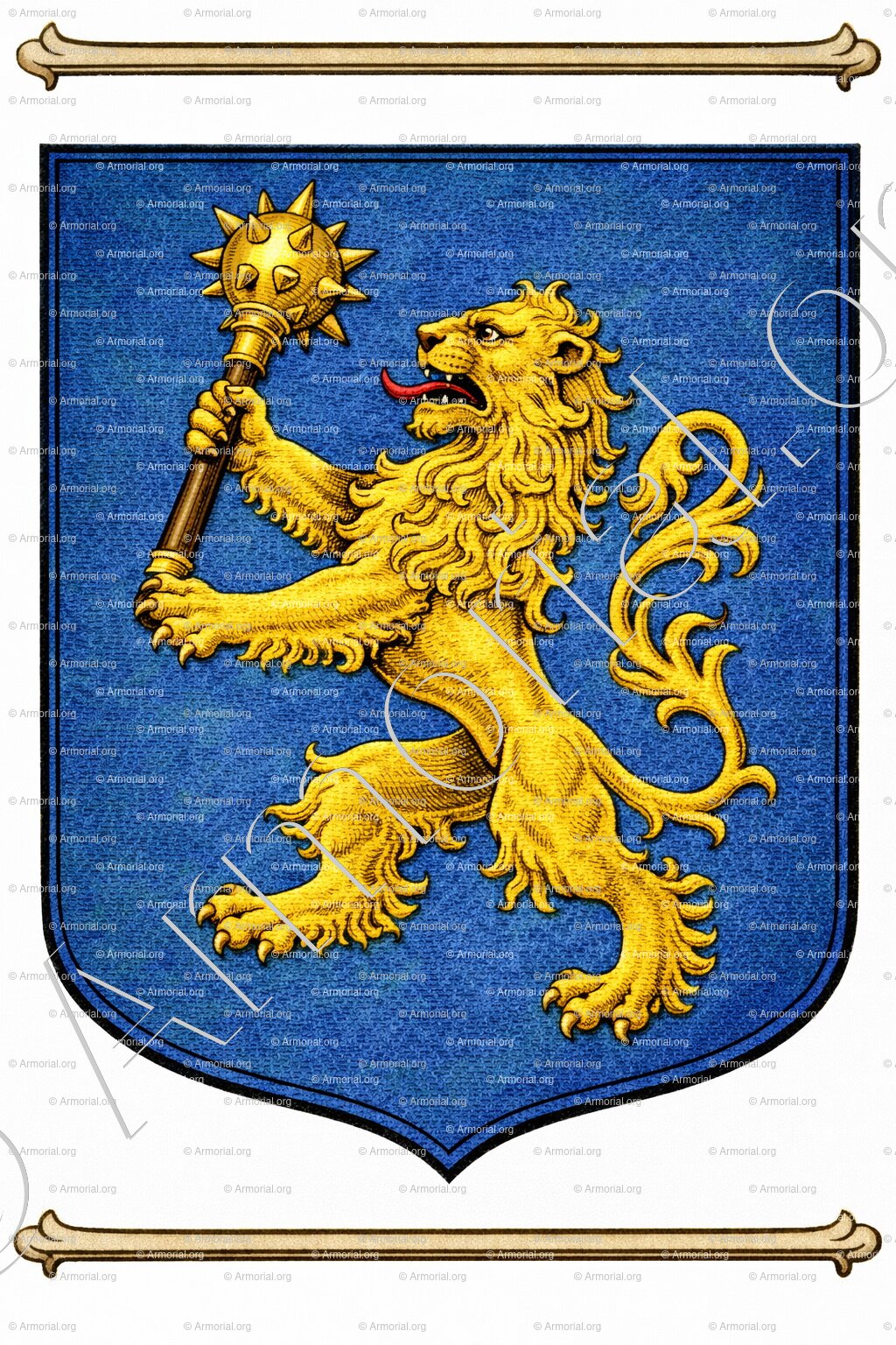 " D'azur au lion rampant d'or tenant une masse d'armes du même. "