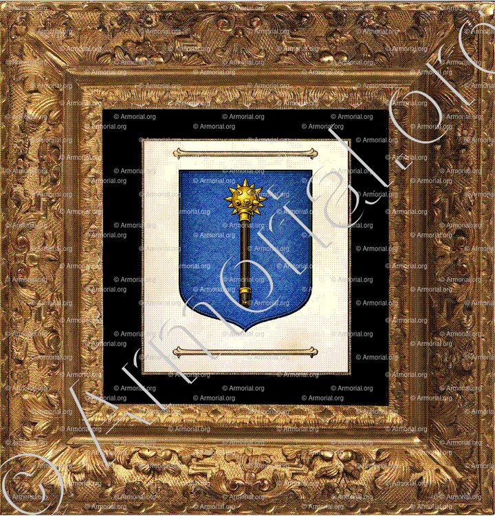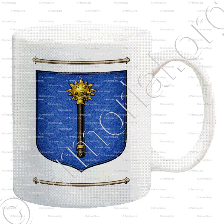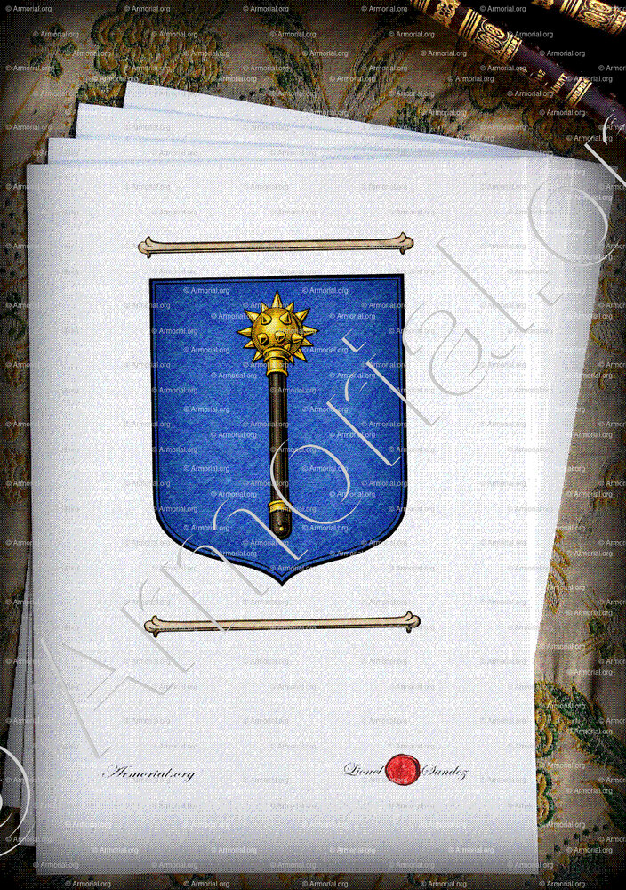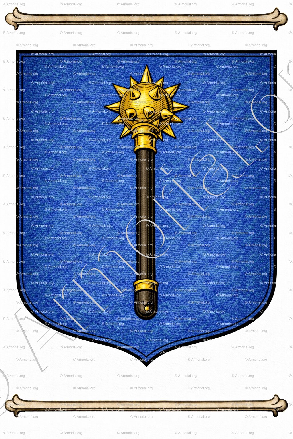 " D'azur à une masse d'armes d'or, maniée de sable, posée en pal. "