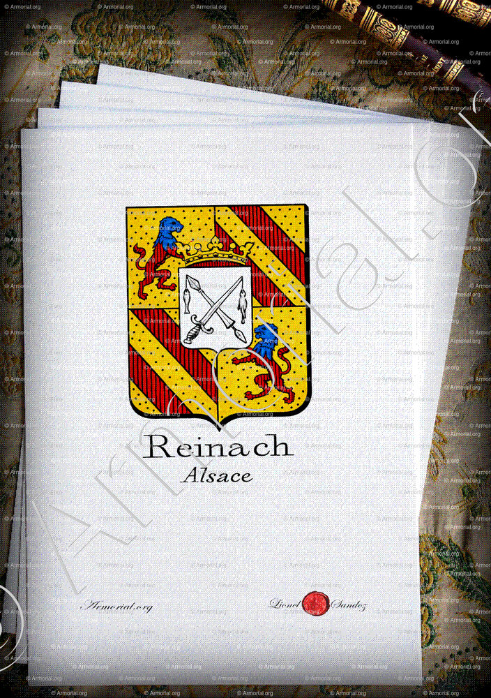 La famille REINACH porte plusieurs armoiries, souvent écartelées avec brisures ou surtout selon les branches et époques.