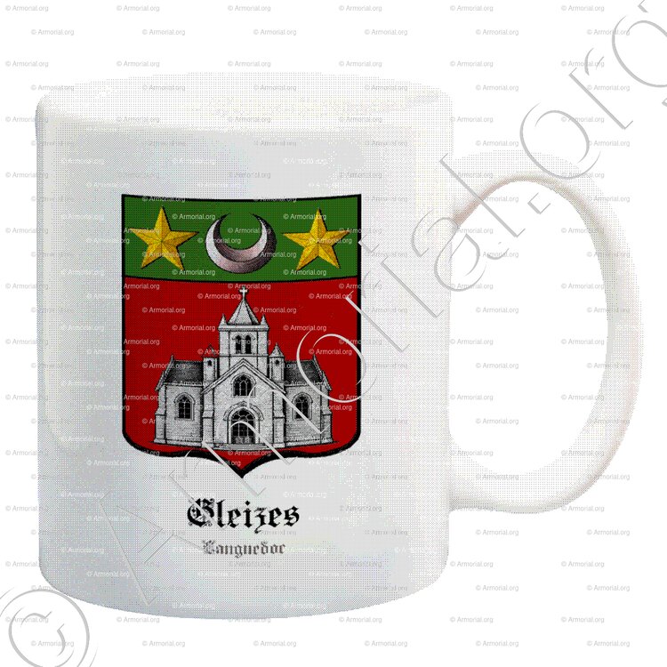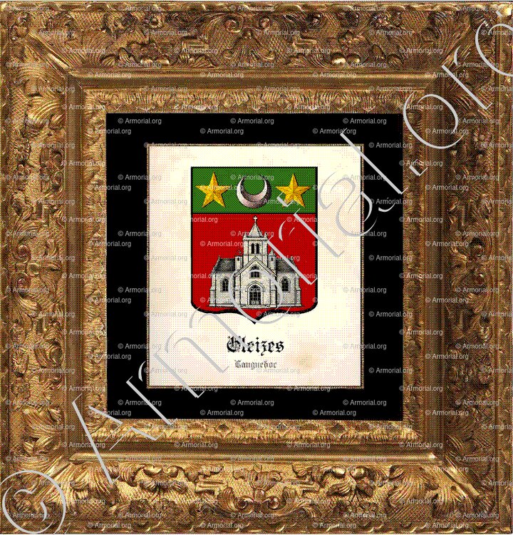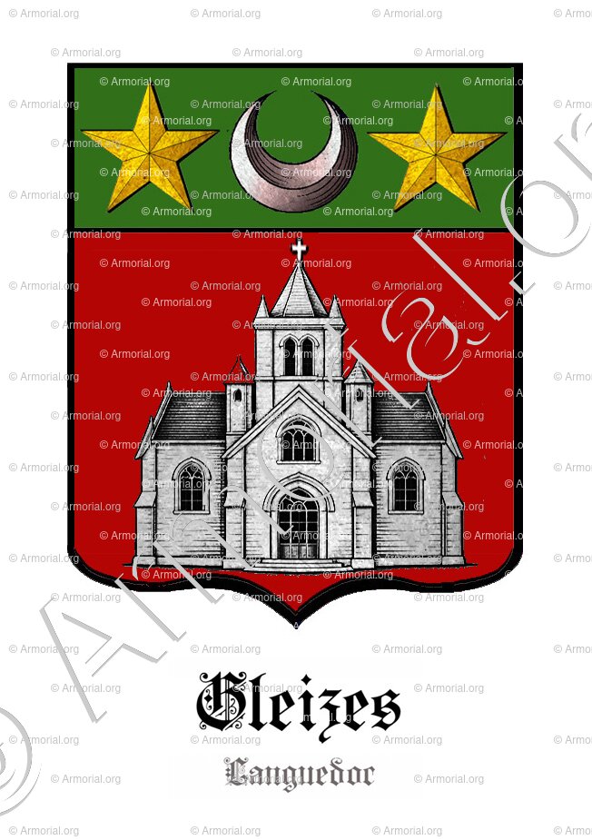 Les armoiries de la famille GLEIZES se blasonnent ainsi : « De gueules, à une église d’argent, et un chef cousu de sinople, chargé d’un croissant d’argent, accompagnée de deux étoiles d’or. »