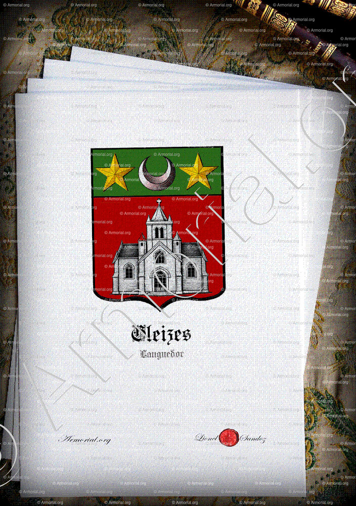 Le blason de la famille GLEIZES constitue des armes parlantes, l’église d’argent faisant directement référence à l’étymologie occitane du nom (« glèisa » = église). L’église symbolise la foi, la communauté et la stabilité. Le champ de gueules évoque le courage, la force et le sacrifice. L’église d’argent représente la pureté et la sincérité. Le chef cousu de sinople chargé d’un croissant d’argent évoque l’espérance, le renouveau et la fertilité ; le croissant peut également indiquer une marque de cadency ou une allusion symbolique à la lune et au cycle de la vie. Les deux étoiles d’or symbolisent la guidance divine, la noblesse d’esprit et la générosité. L’ensemble reflète les valeurs de foi, de courage et d’élévation spirituelle associées à la famille GLEIZES.