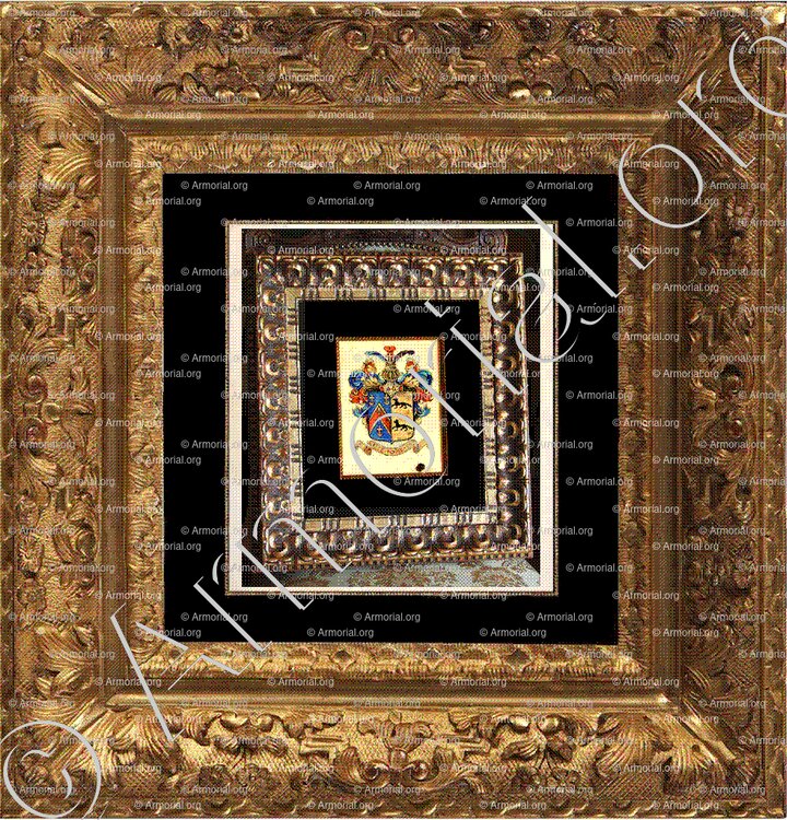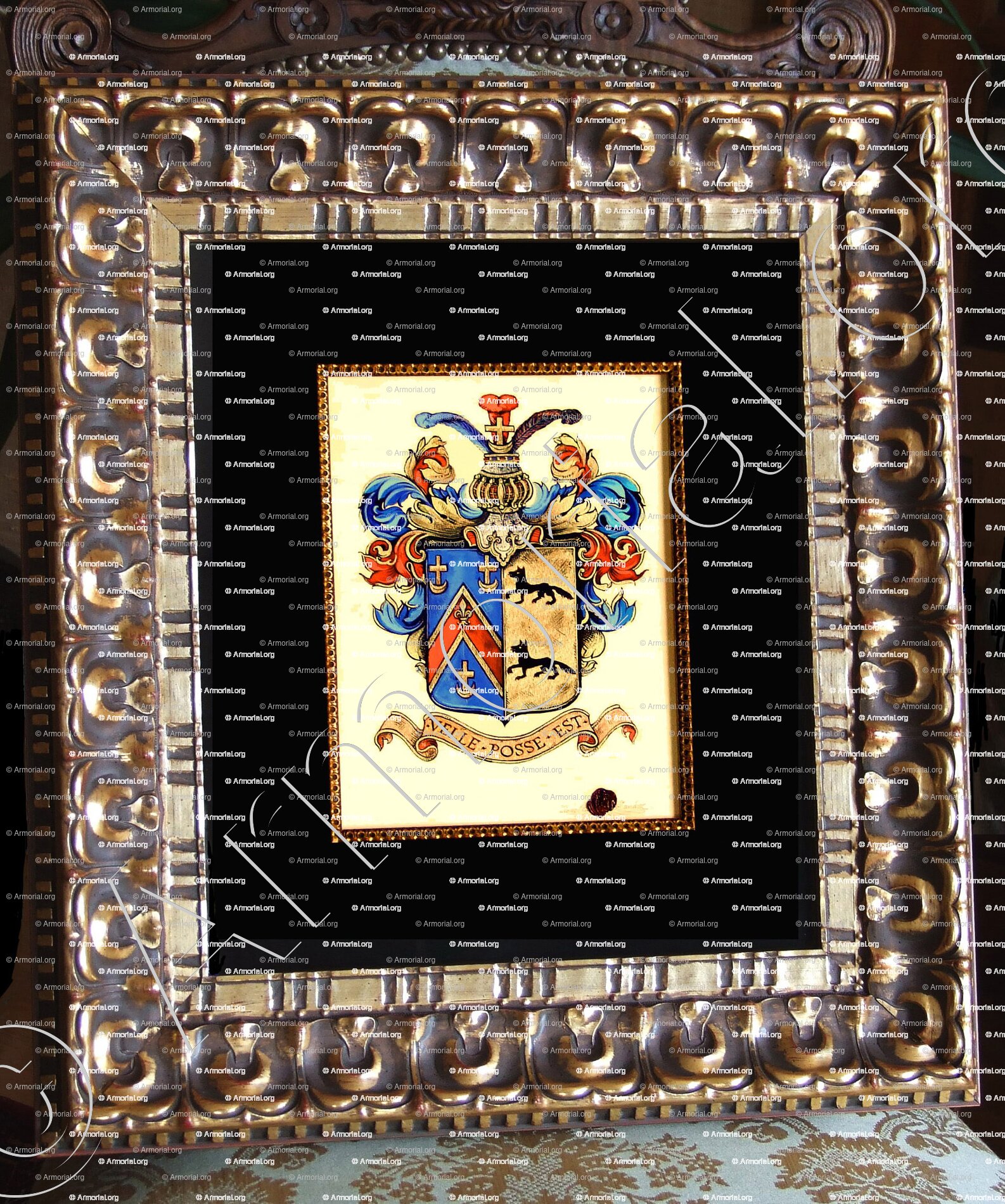 " Parti au 1°: d'azur, au chevron d'or, chargé de gueules, surchargé en chef d'une fleurdelys et accompagné de trois croisettes au pied fiché dans un croissant d'or (qui est MARCLAY) au 2°: d'or, à deux loups de sable passants l'un sur l'autre (qui est BOGET). "