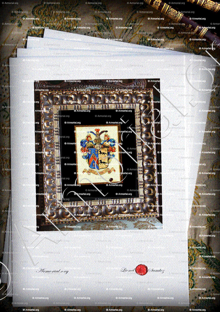 " D’azur, un chevron abaissé de gueules bordé d’or, chargé d’une fleur de lys d’or, accompagné de trois croix latines d’or soutenues chacune d’un croissant d’argent. "