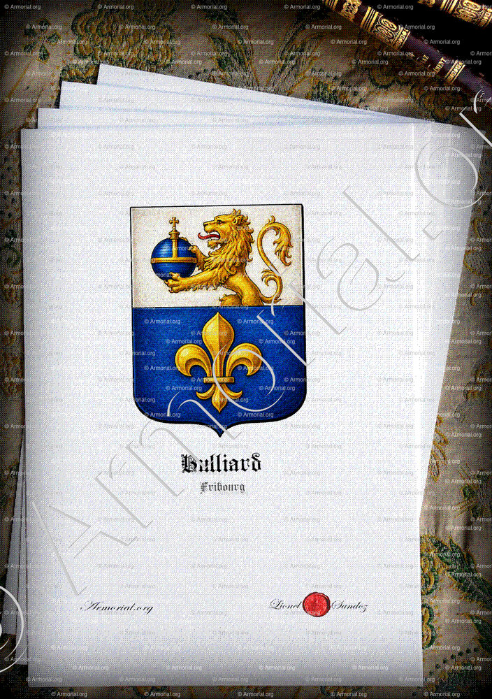 Le blason de la famille BULLIARD associe plusieurs symboles forts de l’héraldique occidentale. Le lion naissant d’or, émergeant de la partition et tenant un monde, évoque la force, le courage et la noblesse, qualités traditionnellement attribuées à cet animal héraldique ; la couleur or renforce l’idée de générosité et de grandeur. Le monde d’azur cintré et croisé d’or symbolise la souveraineté, la connaissance universelle ou la domination spirituelle, souvent associé à la sphère chrétienne et à l’autorité. La fleur-de-lis d’or, placée en champ d’azur, représente la pureté, la foi et la loyauté, emblème historique de la royauté française et de la vertu. L’ensemble du blason, coupé et équilibré, reflète l’harmonie entre puissance terrestre et élévation spirituelle.
