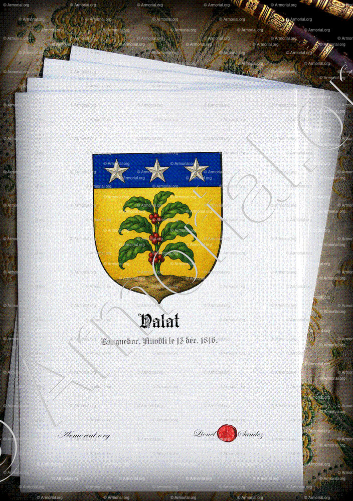 Les armoiries de la famille VALAT sont décrites comme suit dans l’Armorial de Languedoc (page 230, n° 830) et confirmées par les sources héraldiques majeures :