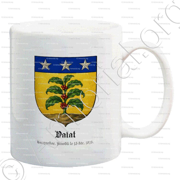 Le champ d’or évoque la noblesse, la générosité et la richesse spirituelle ou matérielle. Le cafier de sinople (vert), arbre rare en héraldique, symbolise la croissance, la vitalité, l’espérance et la prospérité ; ses fruits de gueules (rouge) ajoutent les notions de courage, de force et d’abondance. La terrasse de sable (noir) représente la stabilité, la prudence et l’ancrage sur la terre ancestrale. Le chef d’azur chargé de trois étoiles d’argent symbolise la loyauté, la vérité céleste, la guidance divine et souvent les mérites militaires ou les distinctions honorifiques. Dans son ensemble, le blason de la famille VALAT reflète l’élévation récente à la noblesse, la permanence historique de la lignée et les valeurs de service, de prospérité et de fidélité associées à ses membres.