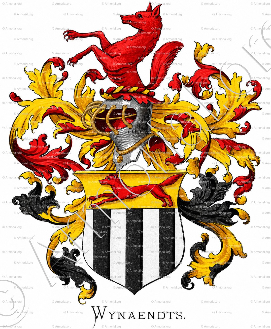 Le blason de la famille WYNAENDTS (WYNANTS VAN RESANDT) est riche en symboles héraldiques traditionnels. Le champ d’argent évoque la pureté, la sincérité et la paix. Les trois pals de sable (bandes verticales noires) symbolisent la force, la constance et la stabilité, qualités souvent associées aux familles patriciennes exerçant des charges durables dans l’administration municipale. Le chef d’or, signe de noblesse et de générosité, surmonte l’écu et renforce l’idée d’élévation et de vertu. Le renard courant de gueules (rouge) placé sur le chef est l’élément le plus parlant : dans l’héraldique occidentale, le renard représente l’intelligence, la ruse positive, la vigilance et l’astuce stratégique. Il peut également évoquer la perspicacité et la capacité d’adaptation, vertus essentielles pour une famille qui a traversé plusieurs siècles d’histoire néerlandaise en occupant des fonctions de responsabilité. Le gueules du renard ajoute une dimension de courage et de vitalité. Dans son ensemble, le blason reflète une lignée à la fois stable et ingénieuse, fidèle à ses racines locales tout en s’adaptant aux évolutions de la société.