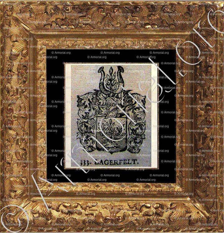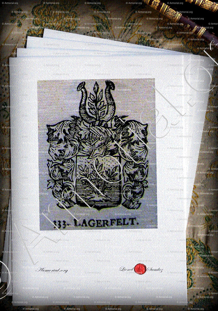 Cimier: une branche feuillée de sinople, entre deux proboscides, coupées alternativement d'or et d'azur.