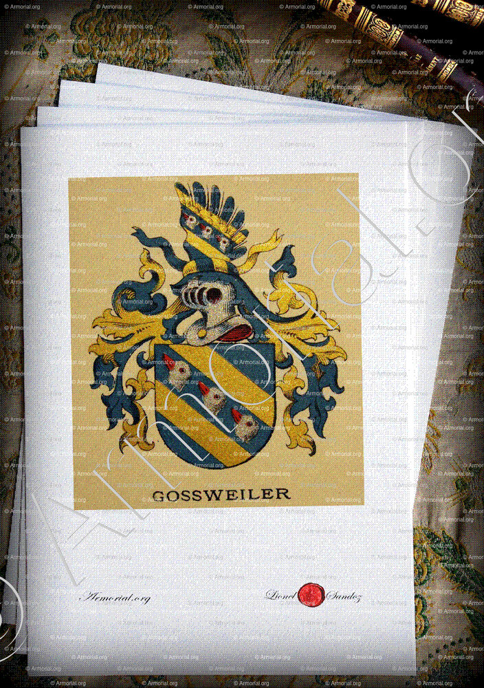 GOSSWEILER est un nom qui s’accompagne d’un blason. Origine :Wappenbuch der Stadt Basel . B.Meyer Knaus 1880, Schweiz