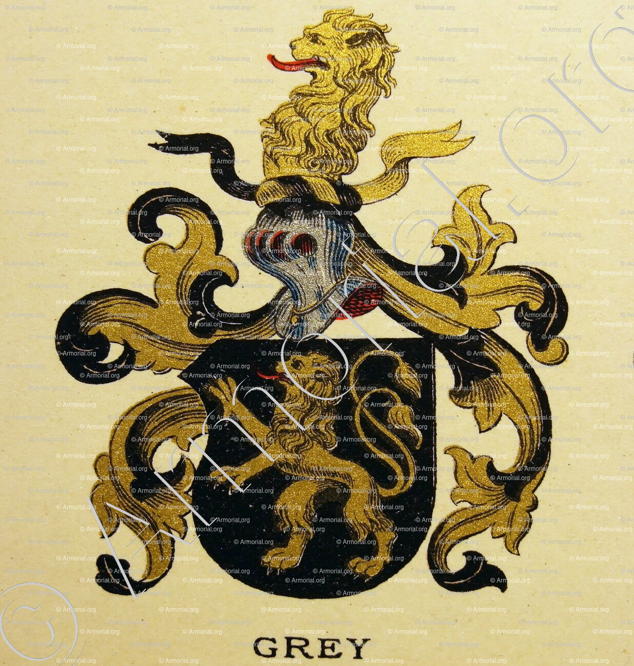 GREY est un nom qui s’accompagne d’un blason. Origine :Wappenbuch der Stadt Basel . B.Meyer Knaus 1880, Schweiz