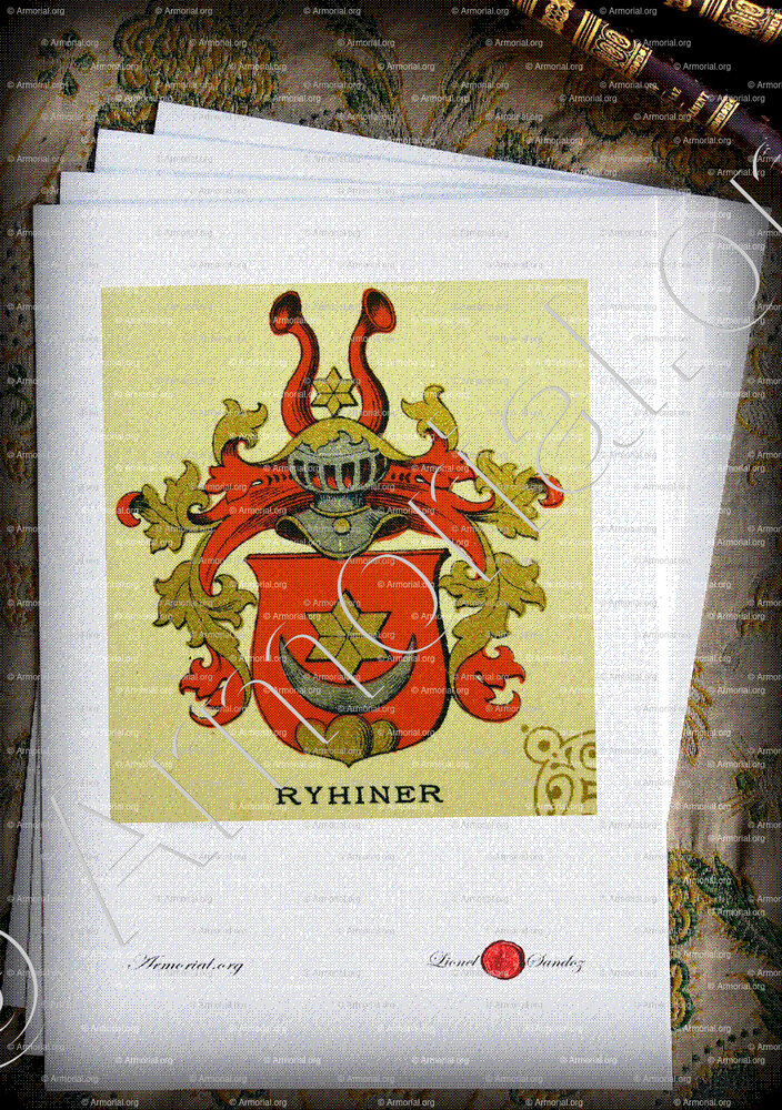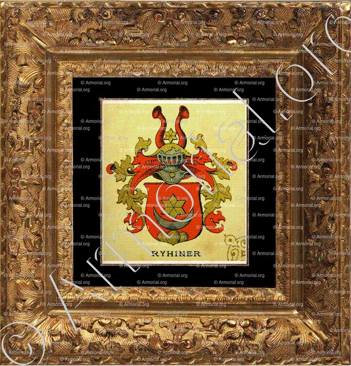 RYHINER est un nom qui s’accompagne d’un blason. Origine :Wappenbuch der Stadt Basel . B.Meyer Knaus 1880, Schweiz