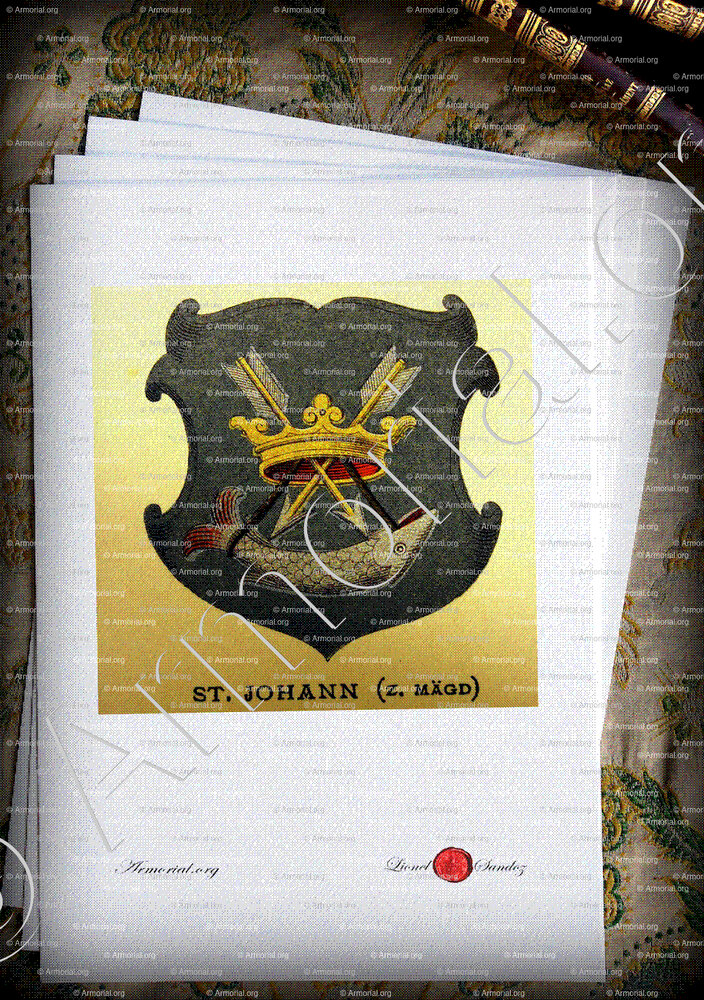 ST. JOHANN zur MÄGD est un nom qui s’accompagne d’un blason. Origine :Wappenbuch der Stadt Basel . B.Meyer Knaus 1880, Schweiz