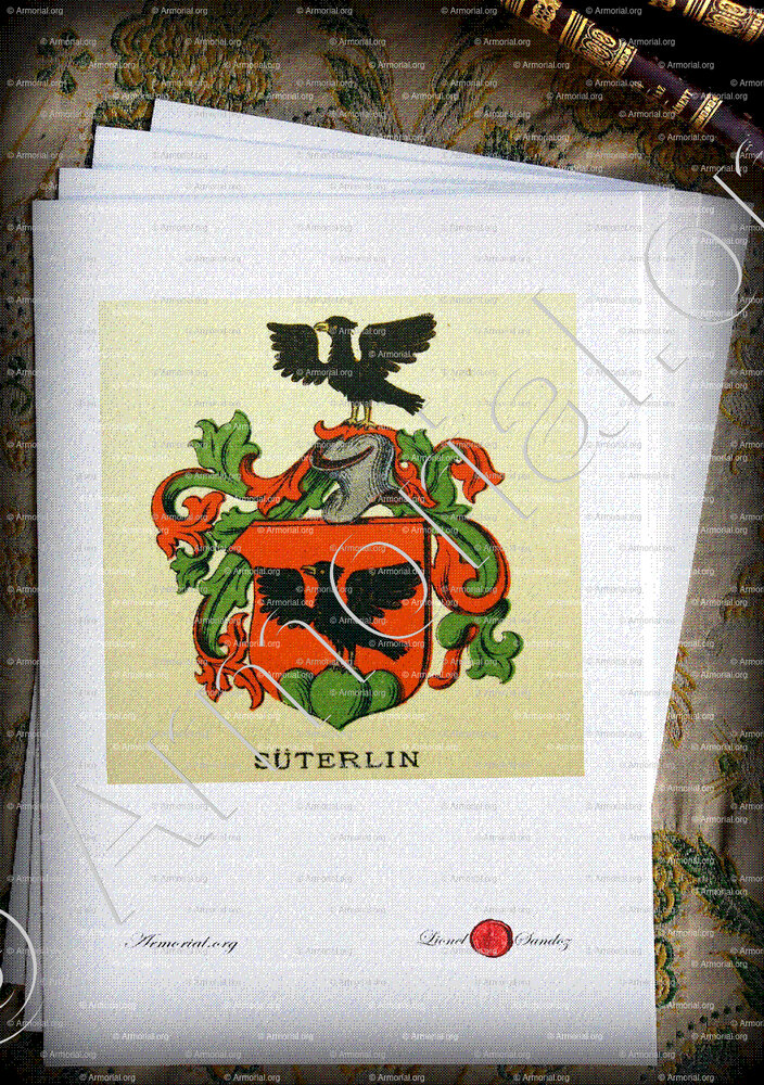 SÜTERLIN est un nom qui s’accompagne d’un blason. Origine :Wappenbuch der Stadt Basel . B.Meyer Knaus 1880, Schweiz
