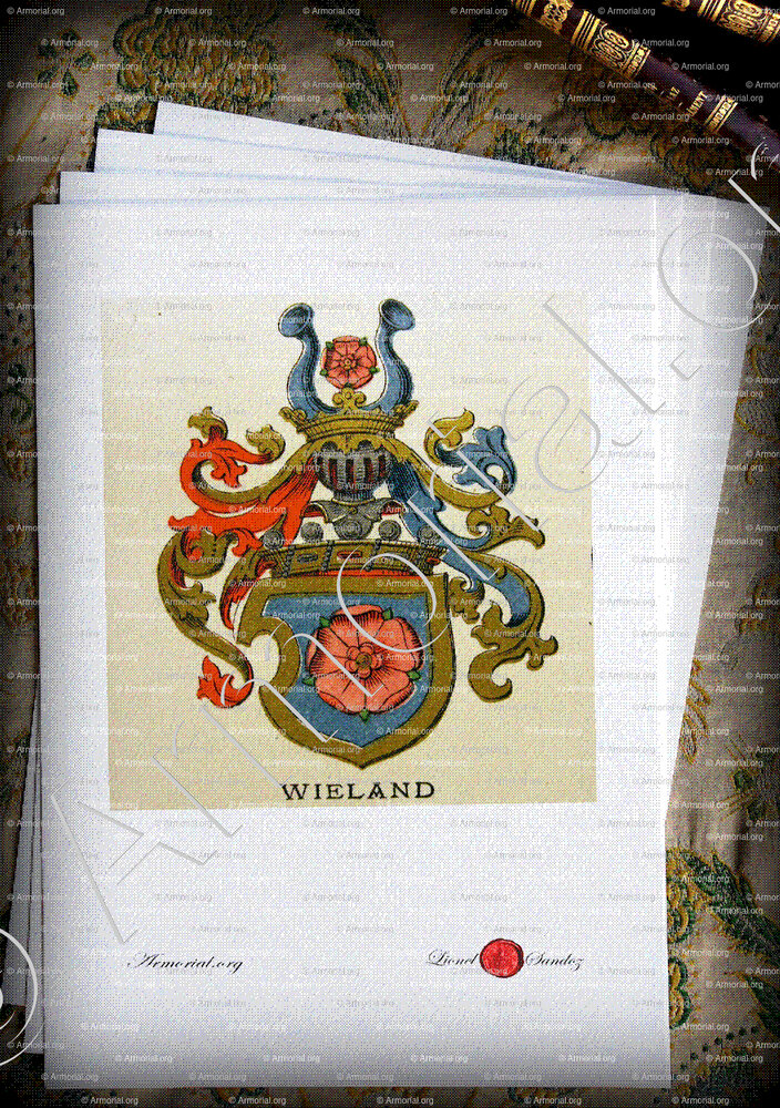 WIELAND est un nom qui s’accompagne d’un blason. Origine :Wappenbuch der Stadt Basel . B.Meyer Knaus 1880, Schweiz