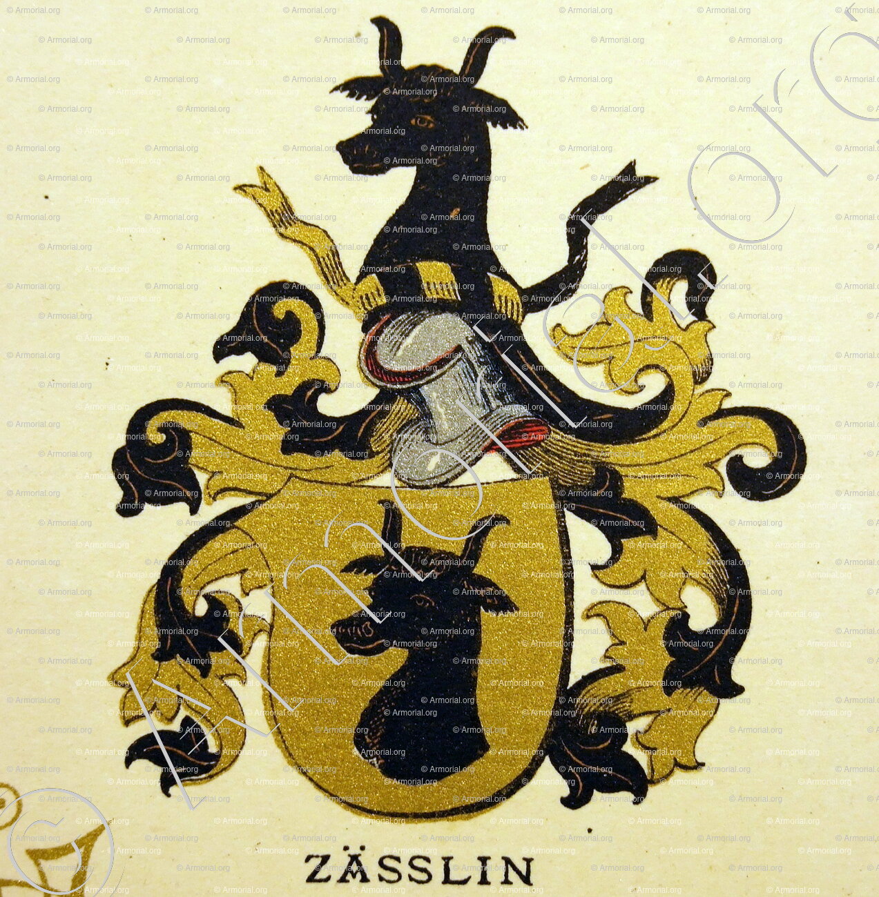 ZÄSSLIN est un nom qui s’accompagne d’un blason. Origine :Wappenbuch der Stadt Basel . B.Meyer Knaus 1880, Schweiz