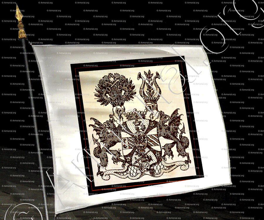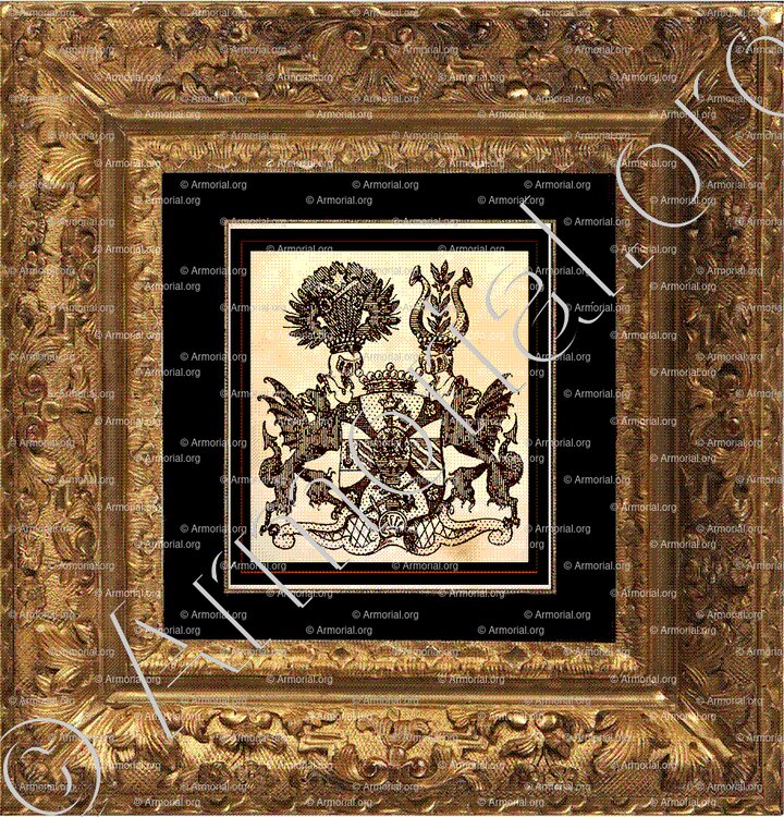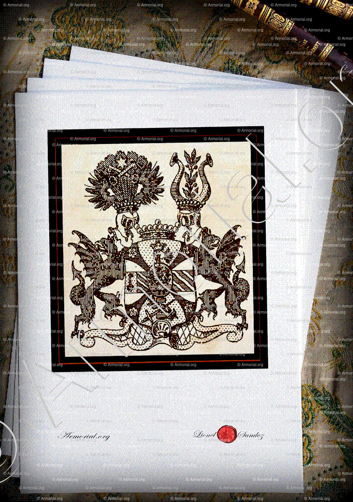 " Écartelé en sautoir: au 1, d'or, à une main de carnation, parée de gueules, posée en fasce, tenant un bâton de commandement de sable, en pal, sommé d'une couronne d'or; au 2, d'argent, à une fasce partie: a. d'or à une clé de sable, en pal, le panneton tourné à senestre; b. de gueules à trois bandes ondées d'argent; au 3, d'argent, à la fasce d'azur, chargée de trois bandes ondées d'argent; au 4, d'or, à une épée d'argent, garnie d'or, posée en barre, et une branche de laurier de sinople, posée en bande, passées en sautoir, accompagné de deux billettes couchées d'azur, 1 en chef et 1 en pointe. Au sautoir patté de sable, brochant sur l'écartelé, l'extrémité de chaque branche chargé d'une rose d'argent. Sur le tout un écusson ovale d'or à la champagne d'azur, l'or chargé de trois rameaux de laurier accostés de sinople, mouv. d'une racine d'or, posée sur l'azur. Deux casques couronnés."
