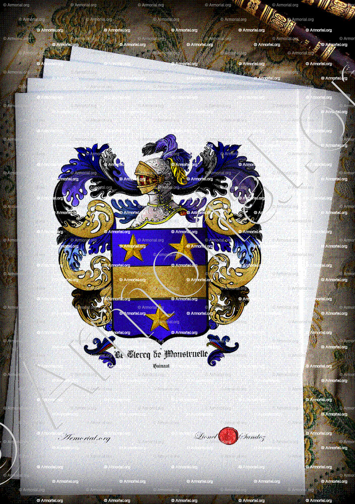 Origine du blason " Le CLERCQ de MONSTRUELLE " : " Hainaut, Belgique (i) "