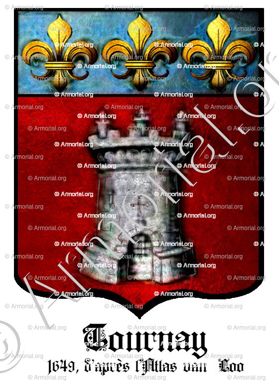 Origine du blason " TOURNAY " : " 1649, d'après l'Atlas de van Loo, Belgique "