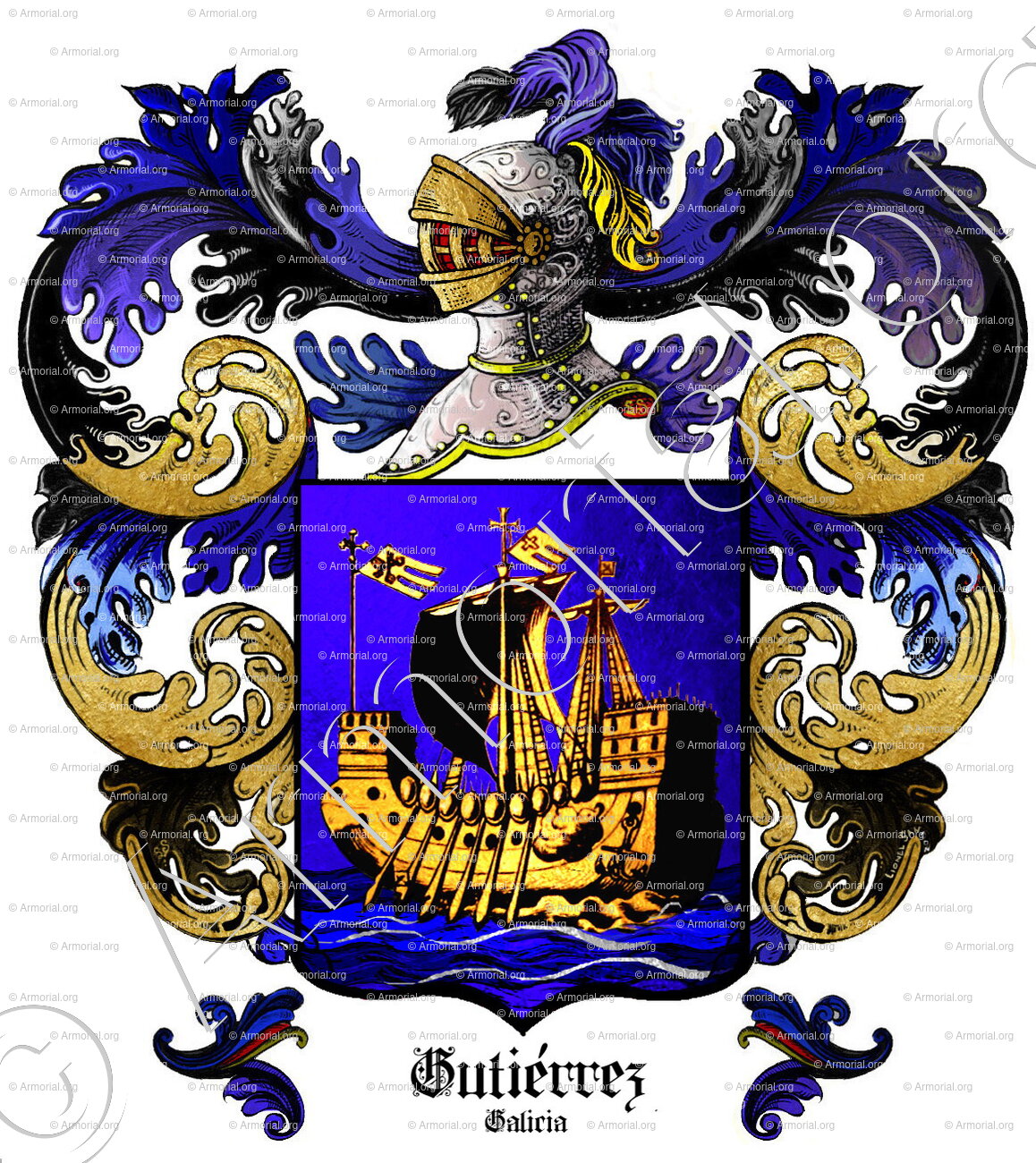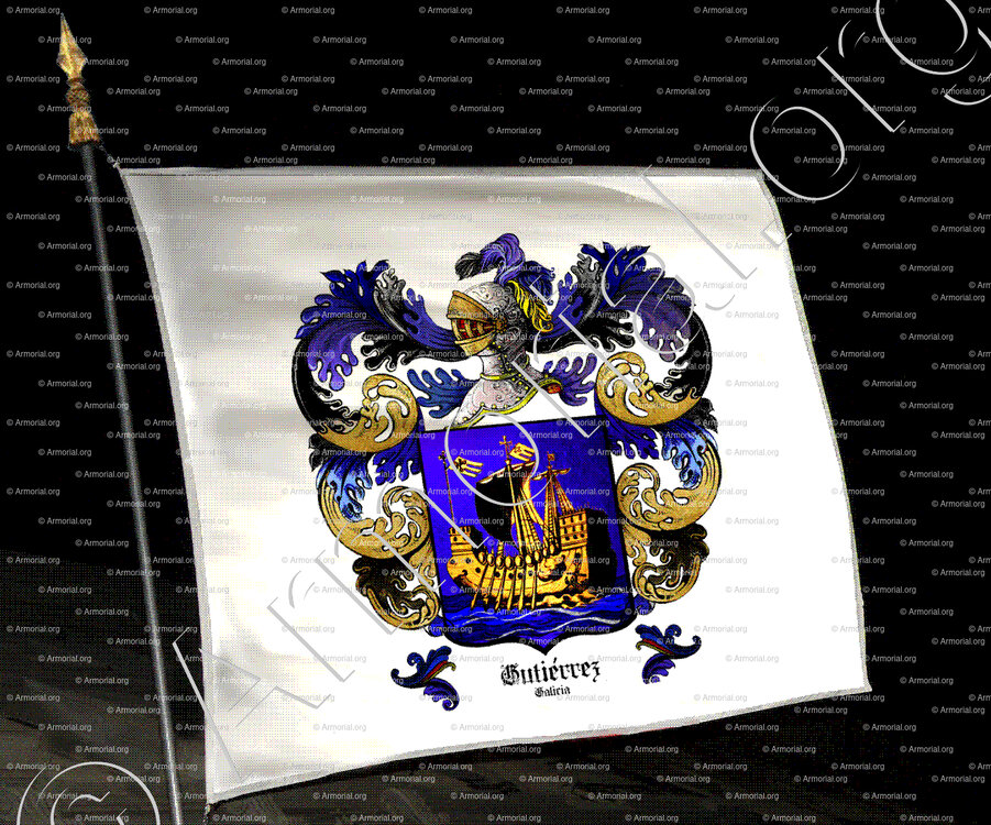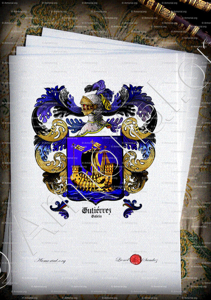 Cette description évoque un champ bleu chargé d'un navire doré naviguant sur des vagues alternant bleu et argent. D'autres variantes existent pour les GUTIÉRREZ galiciens (par exemple, cinq marcos d'argent sur azur), mais celle à la caravelle est spécifiquement associée à certaines lignées de Galice.