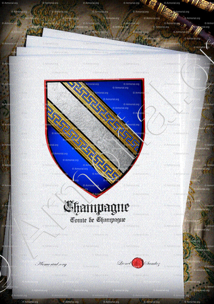 "D'azur, à la bande d'argent, côtoyée de deux doubles cotices d'or potencées et contre-potencées."