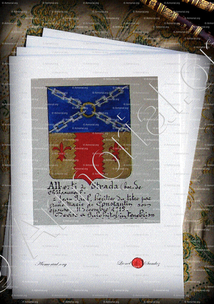 1. Un magnifique fac-similé aquarellé sur papier Vélin d’Arches (format A4) de ce blason