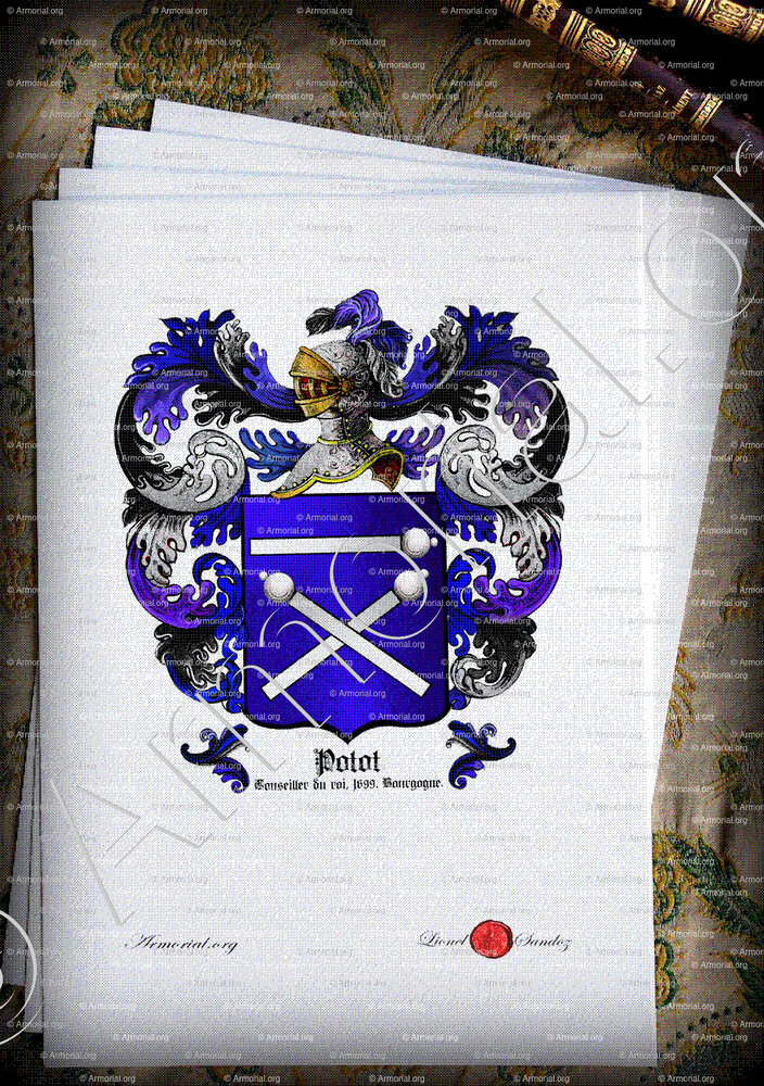 - Michel POTOT, Conseiller du Roi, probablement actif à la fin du XVIIe ou au début du XVIIIe siècle, inscrit dans les milieux juridiques ou administratifs de Bourgogne ou du Centre-Est. Le port d’armoiries à triple poteau d’argent sur azur indique son rang et son importance au service de la Couronne.